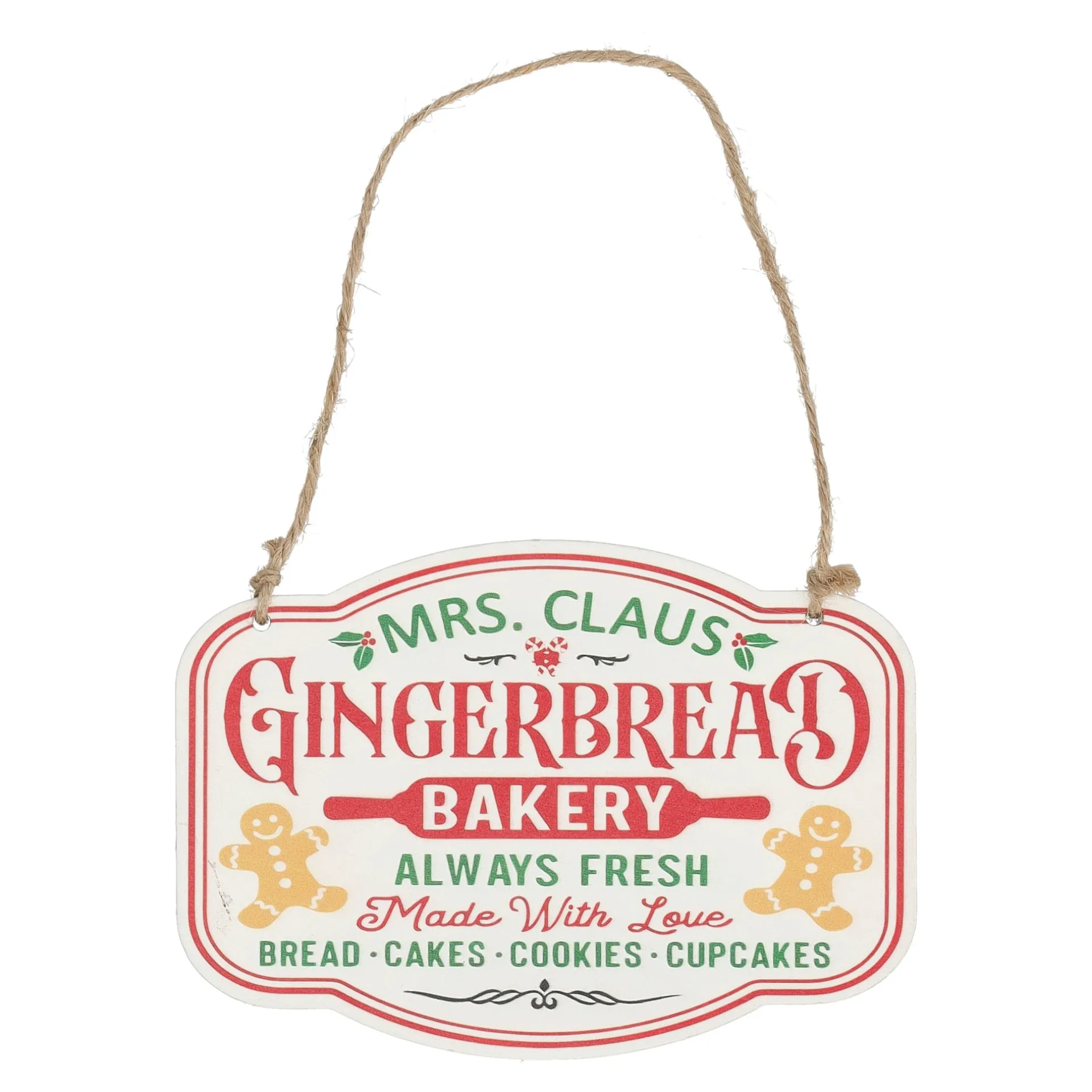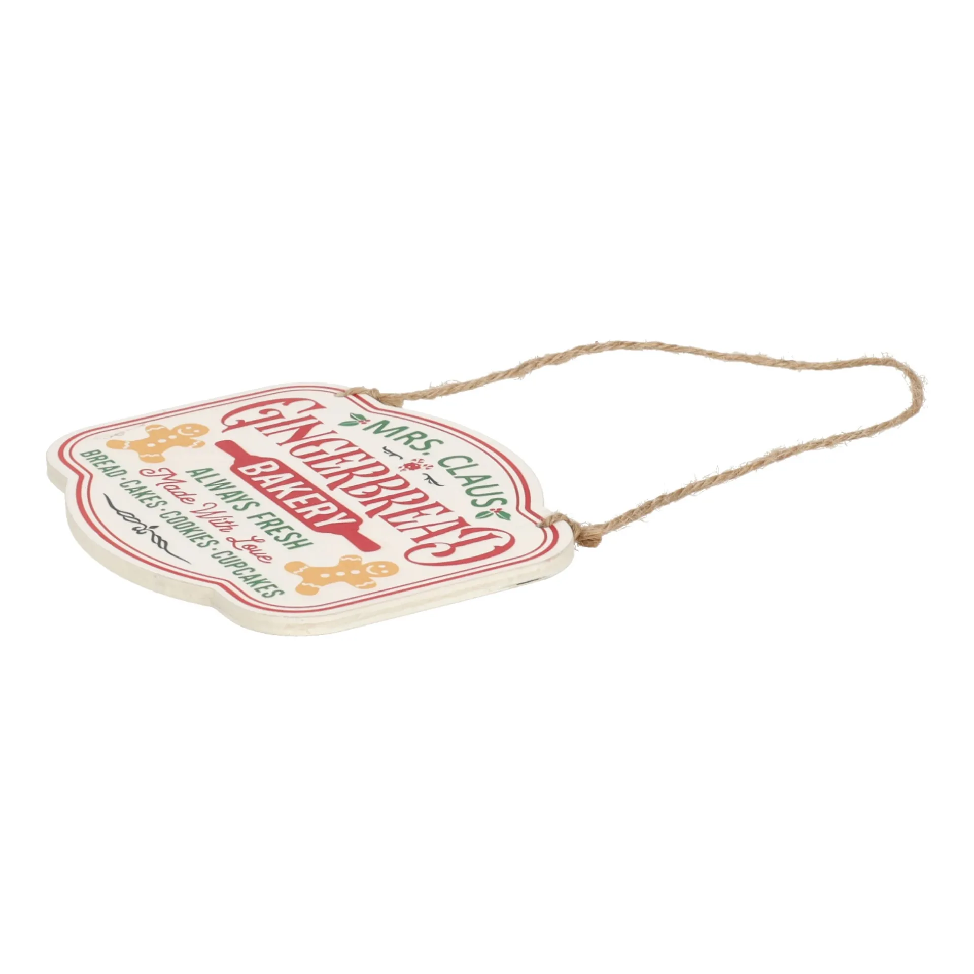 Deze decoratieve hanger met de tekst Mrs. Claus Gingerbread Bakery brengt een vrolijke baksfeer in huis tijdens de feestdagen. De hanger is uitgevoerd in rood, groen en wit en versierd met twee schattige gingerbreadfiguurtjes.