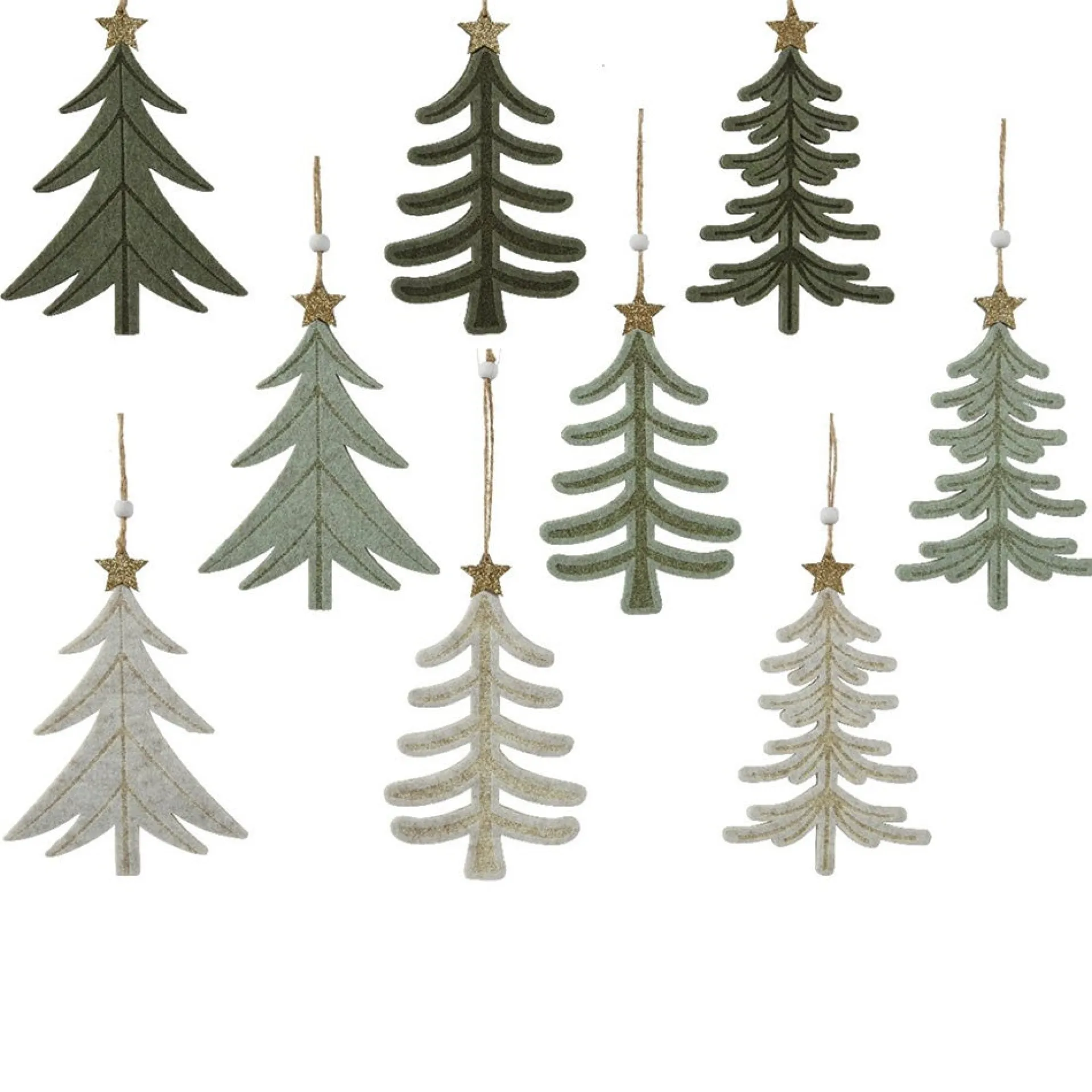 Vilten hanger in de vorm van een kerstboom van 18 cm hoog, met ster en ophangkoord. Verkrijgbaar in negen groentinten voor een natuurlijke kerstlook.