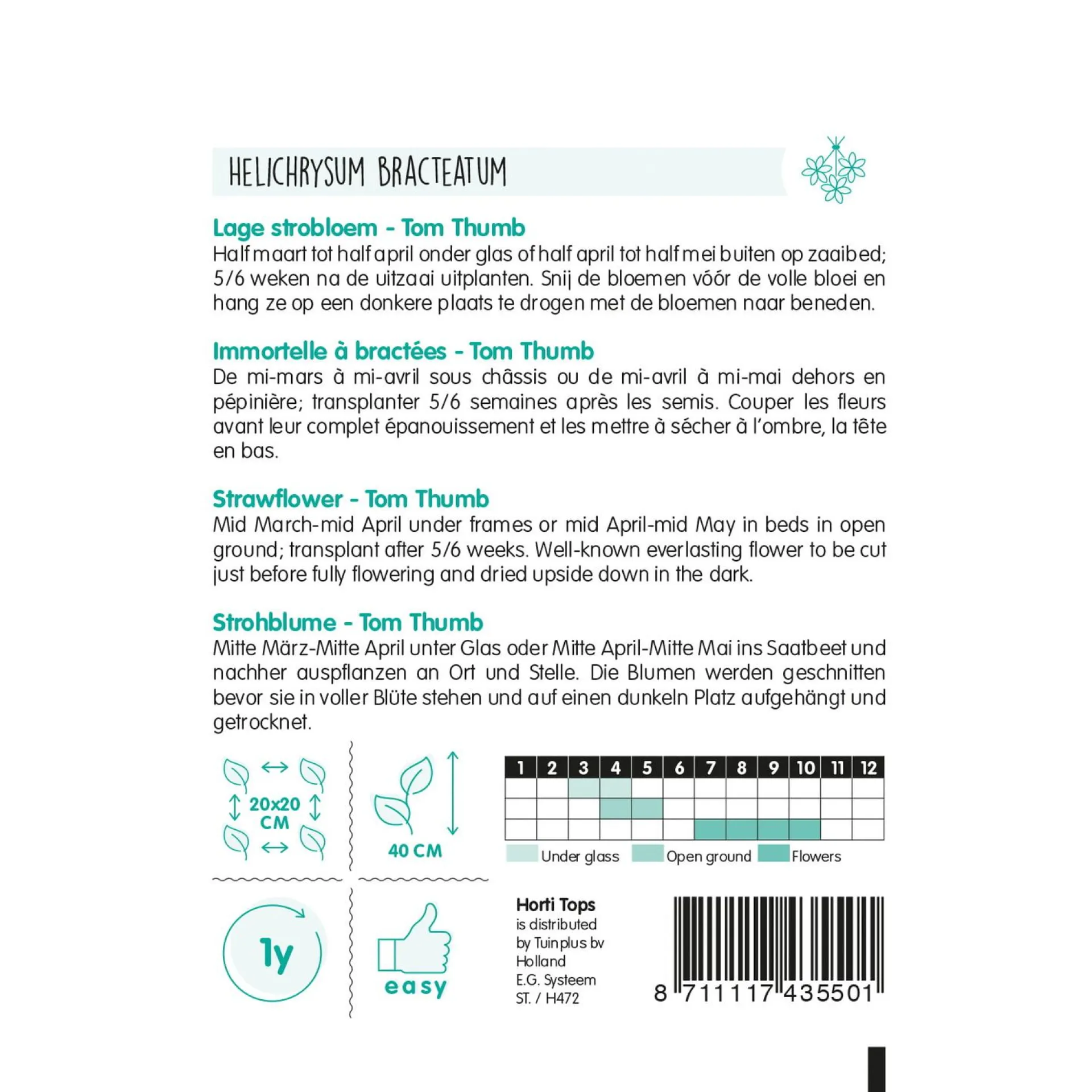 De Helichrysum Tom Thumb is een lage strobloem met compacte groei en kleurrijke bloemen. Deze zomerbloeiende plant is perfect voor borders, bloembakken en droogboeketten.