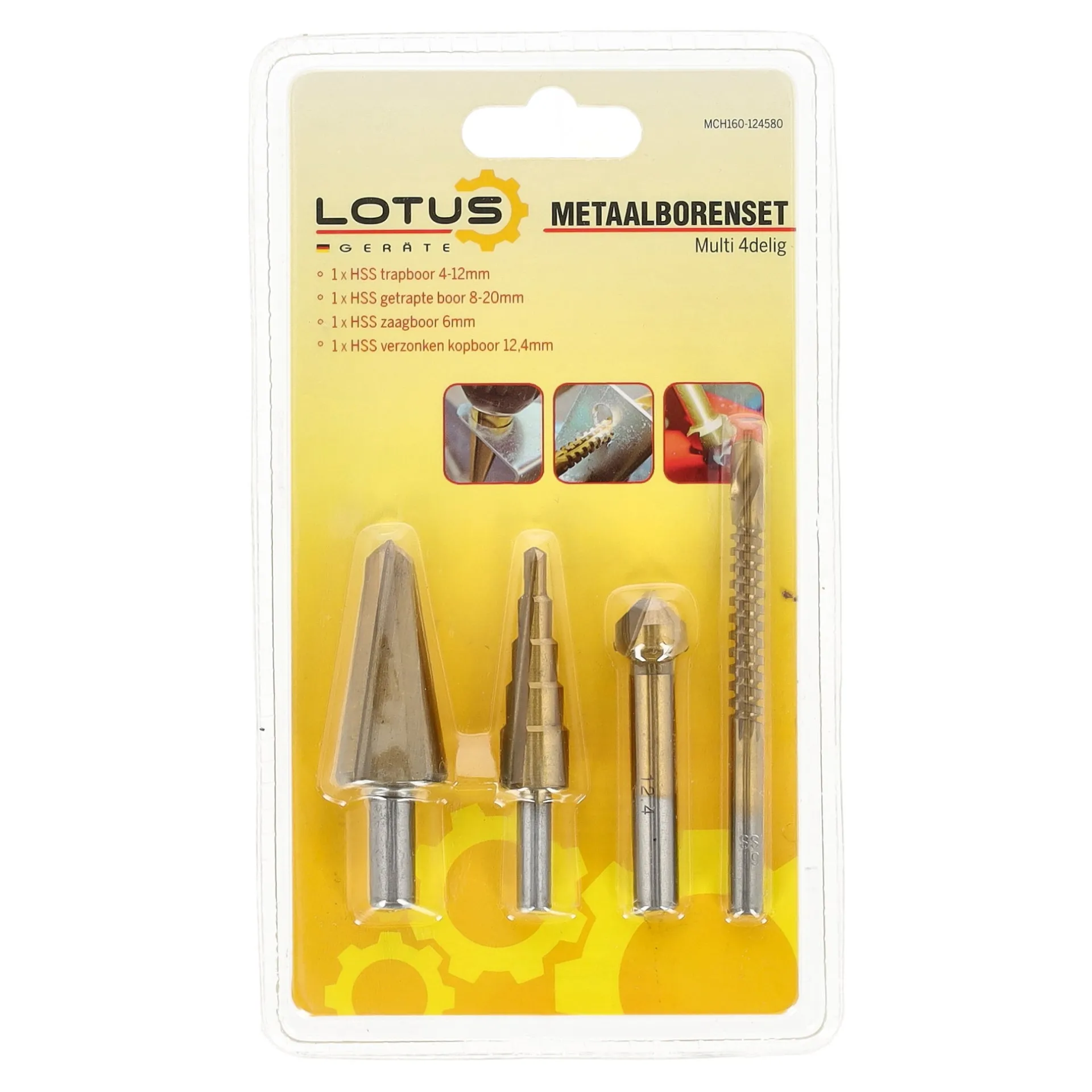 Deze metaalborenset van Lotus bestaat uit vier HSS-boren voor verschillende boortoepassingen in metaal. De set combineert meerdere boortypes in één verpakking en is geschikt voor uiteenlopende boorklussen..
