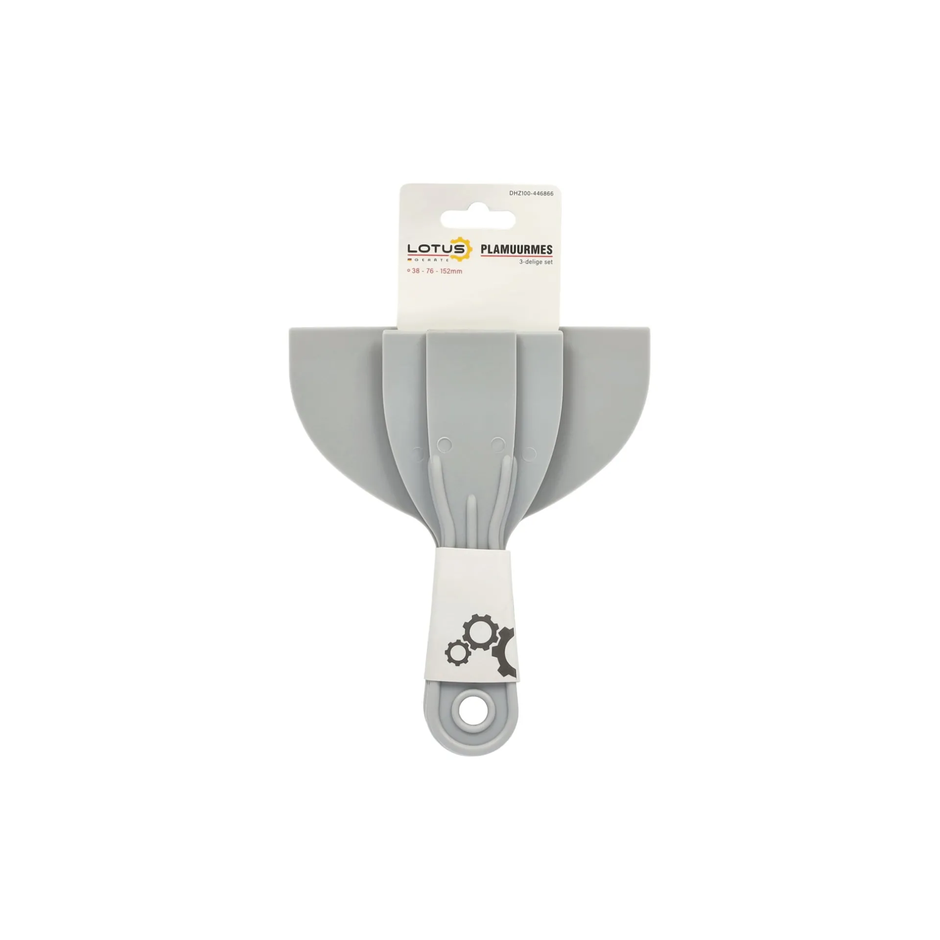 Lotus 3-delige set, met kunststof plamuurmessen van 38, 76 en 152 mm breed. Geschikt voor het aanbrengen en gladstrijken van plamuur of vulmiddel op wanden en plafonds.