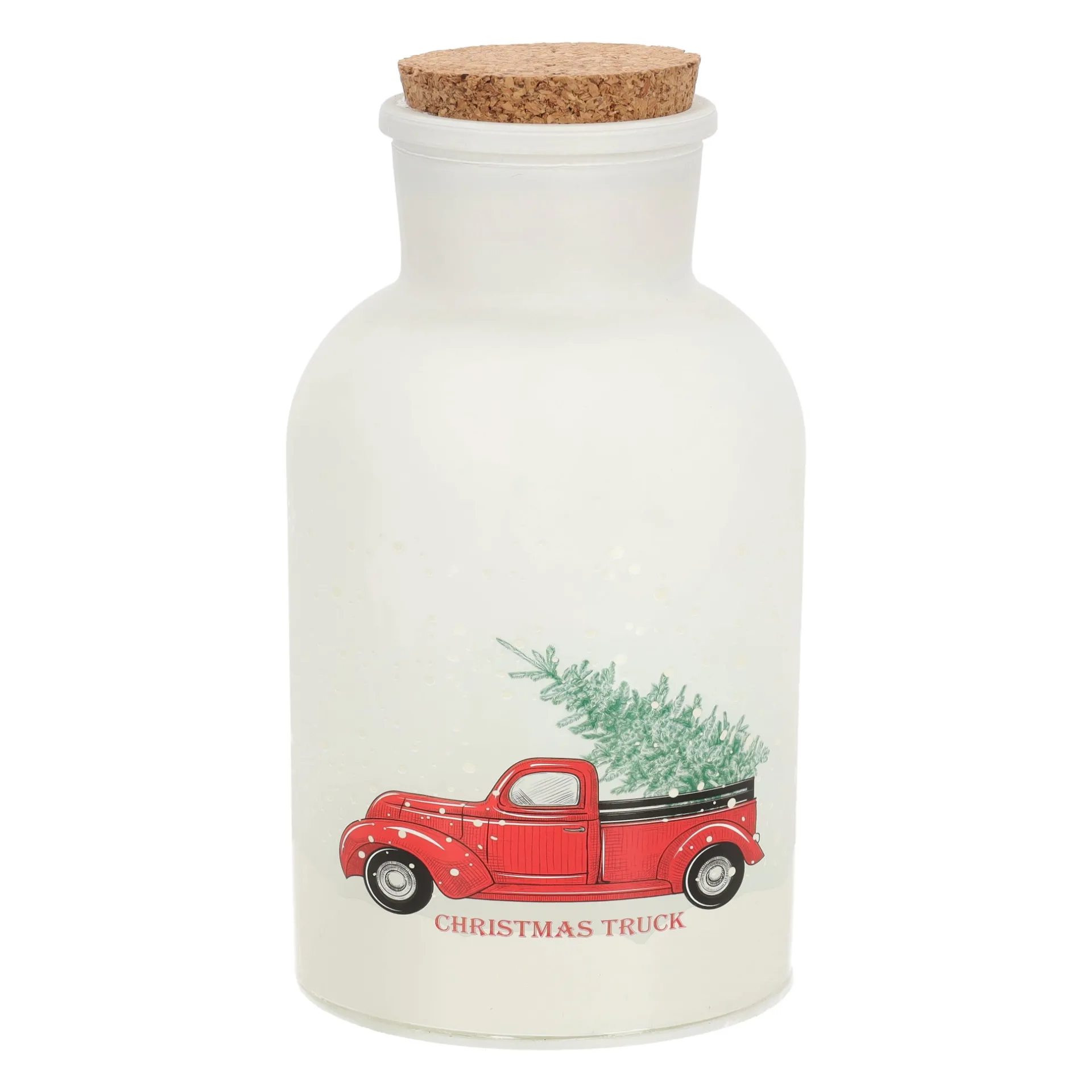 Sfeervolle decoratie in matglas met kurken dop en kerstprint. De geïntegreerde LED-verlichting zorgt voor een warm en gezellig licht. Verkrijgbaar in twee varianten.