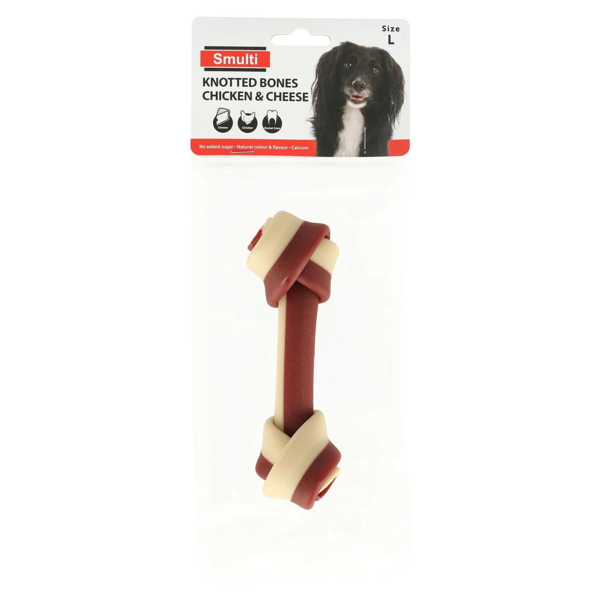 De knoopbeen kip+kaas is een smakelijke en stevige kauwsnack voor honden, gemaakt van gedroogd bot in de vorm van een knoop, omhuld met een laagje kip en kaas. Deze snack biedt langdurig kauwplezier en helpt bij het reinigen van het gebit door het verminderen van tandplak en tandsteen. Het heerlijke kip- en kaasmengsel maakt het extra aantrekkelijk voor honden. Rijk aan eiwitten en zonder kunstmatige toevoegingen, is dit knoopbeen een verantwoorde keuze als beloning of tussendoortje voor honden van alle rassen en leeftijden. Een smakelijke en gezonde traktatie voor je hond! Laat de hond niet alleen met kauwmateriaal. Zorg voor vers water.