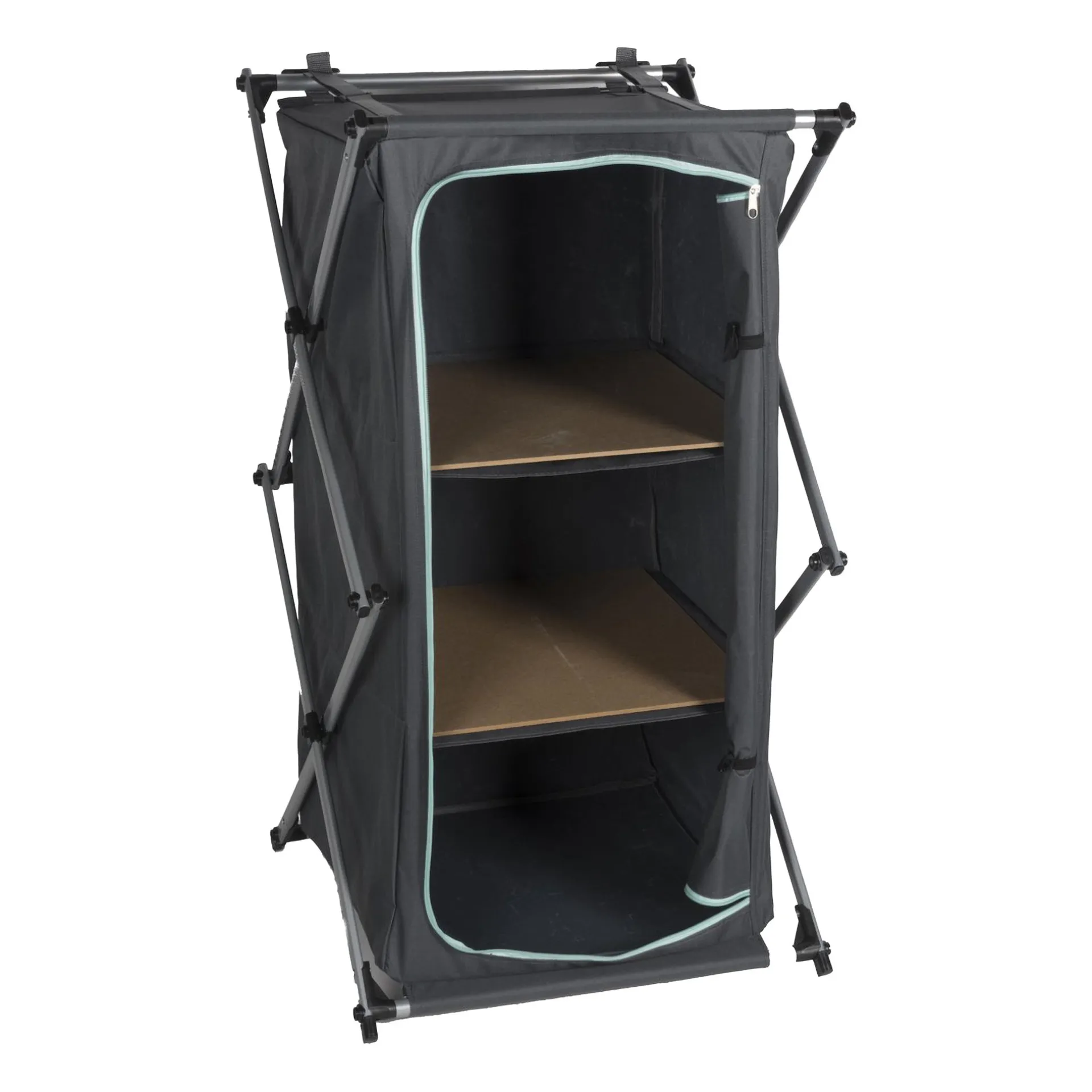 Compacte campingkast, ideaal voor opbergruimte, eenvoudig in elkaar te zetten, met afmetingen van 95 x 53 x 49 cm.