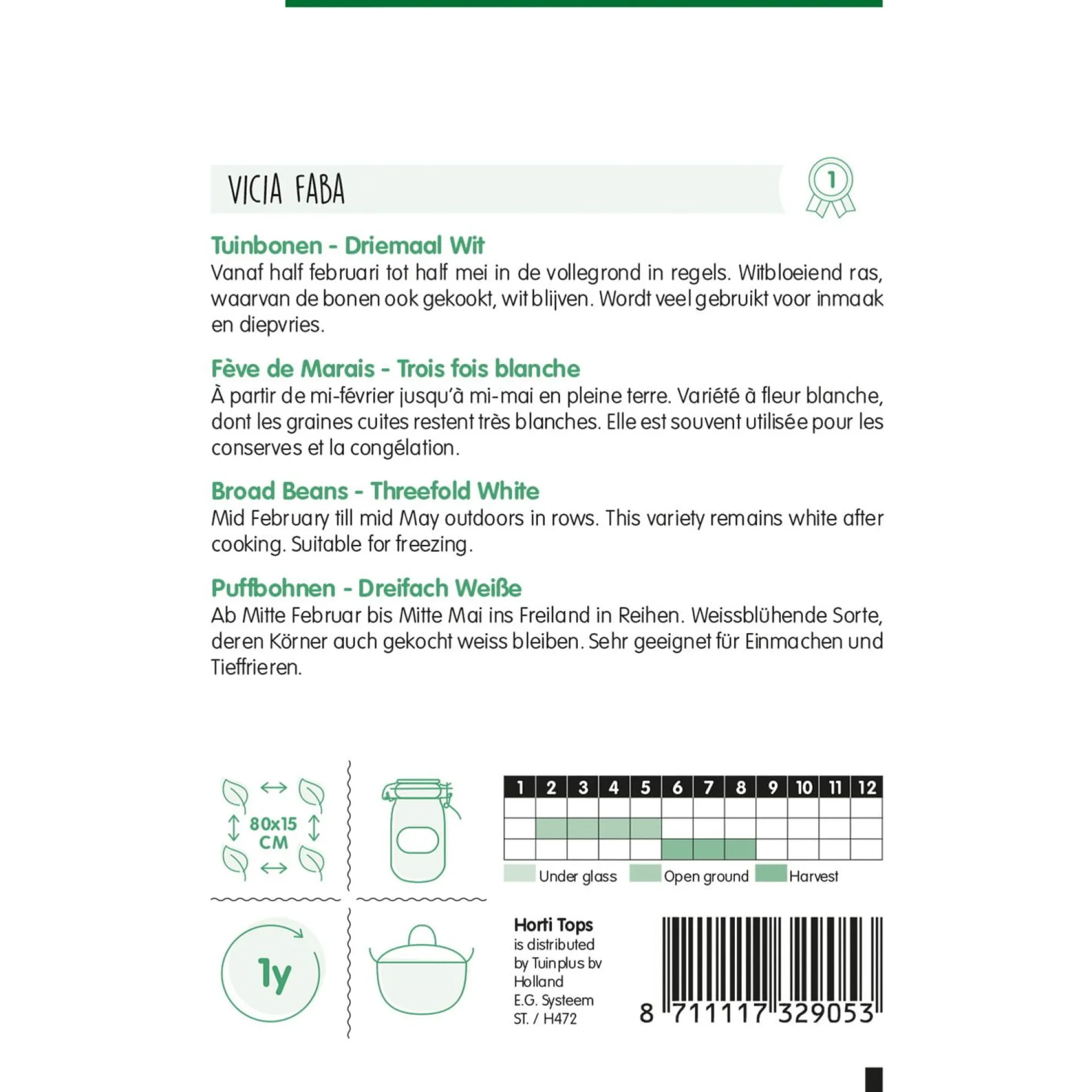 Vanaf half februari tot half mei in de vollegrond in regels. Witbloeiend ras, waarvan de bonen ook gekookt, wit blijven. Wordt veel gebruikt voor inmaak en diepvries.