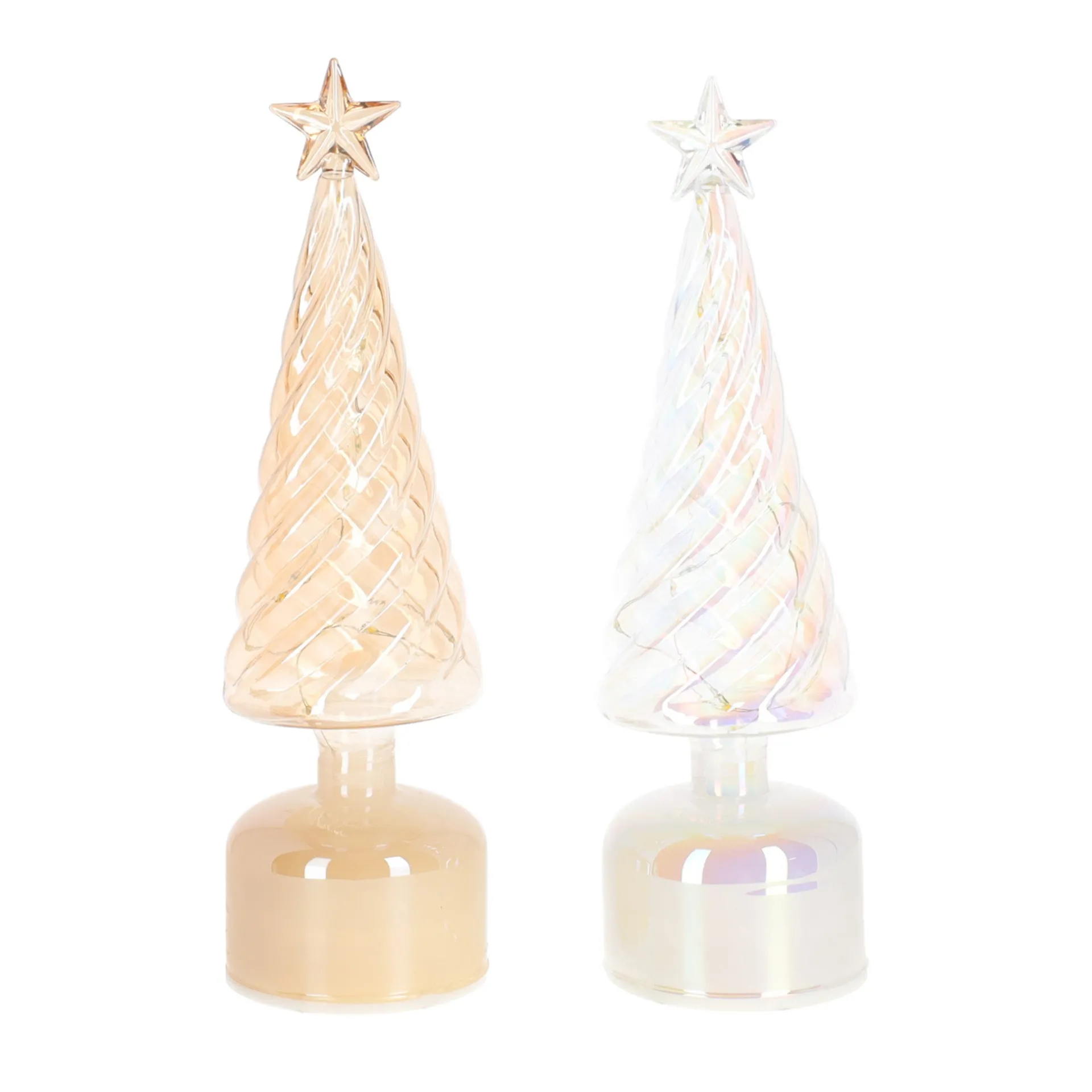 Decoratieve glazen kerstboom met geïntegreerde LED-verlichting. De boom heeft een gestileerde, gelaagde vorm, staat op een ronde glazen basis en de kleur heeft een iriserend effect. Deze kerstboom is de perfecte toevoeging aan je kerstdecoratie of gedekte kersttafel en verkrijgbaar in diverse maten, modellen en kleuren die bij elkaar een sfeervol geheel vormen.