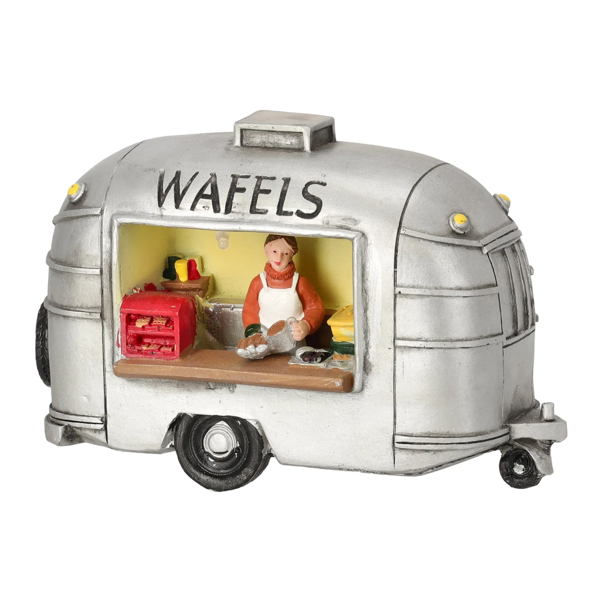 Deze miniatuur foodtruck heeft een zilverkleurige buitenkant met bovenaan het opschrift Wafels. Door het open raam zie je de verkoper die wafels bereidt, met kookgerei en kleine details op het aanrecht. De kraam staat op wieltjes en past perfect in een winterse kerstdorpsetting.