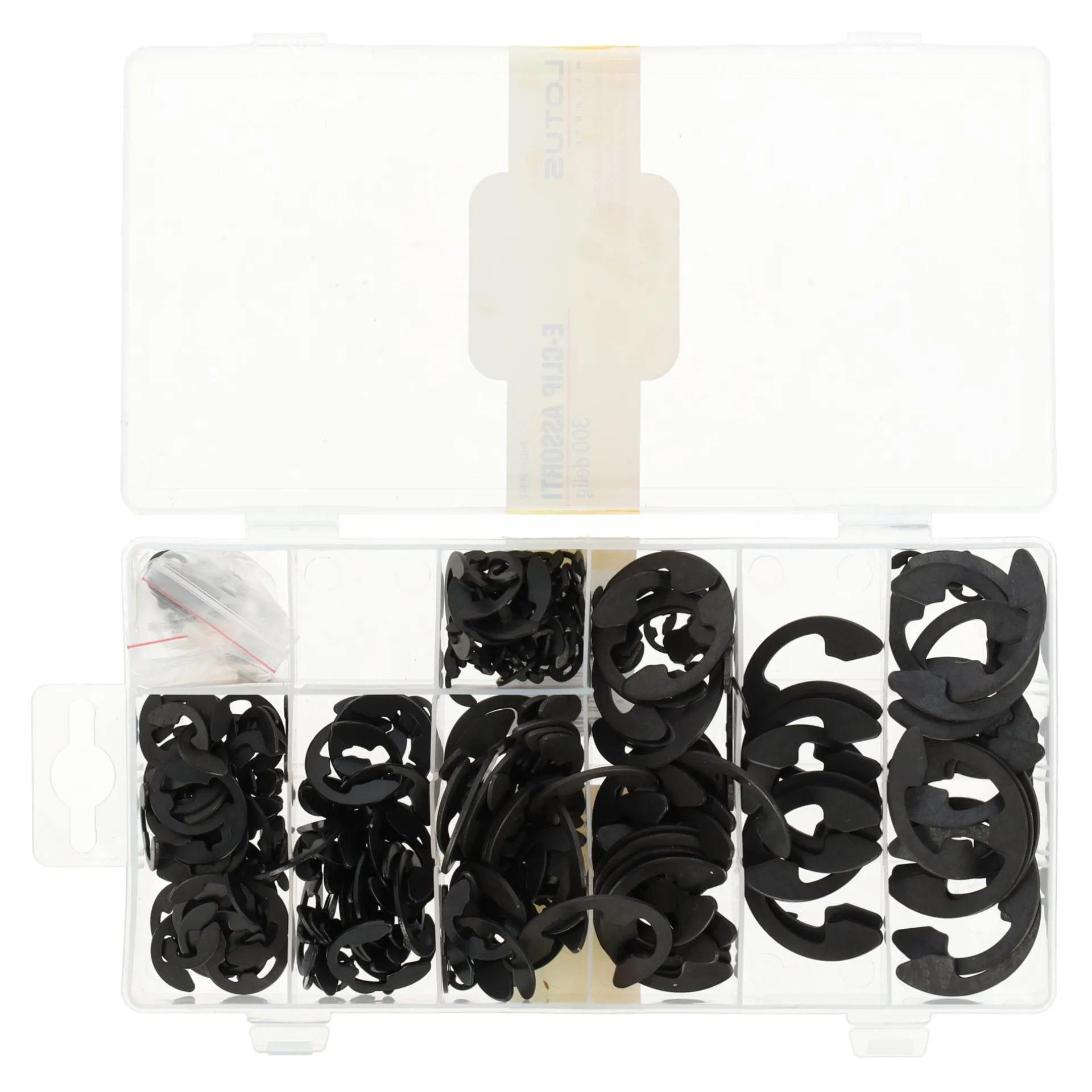 In deze E-clip set zitten 300 zwarte E-clips in verschillende maten, overzichtelijk opgeborgen in een transparante opbergdoos met vakverdeling.