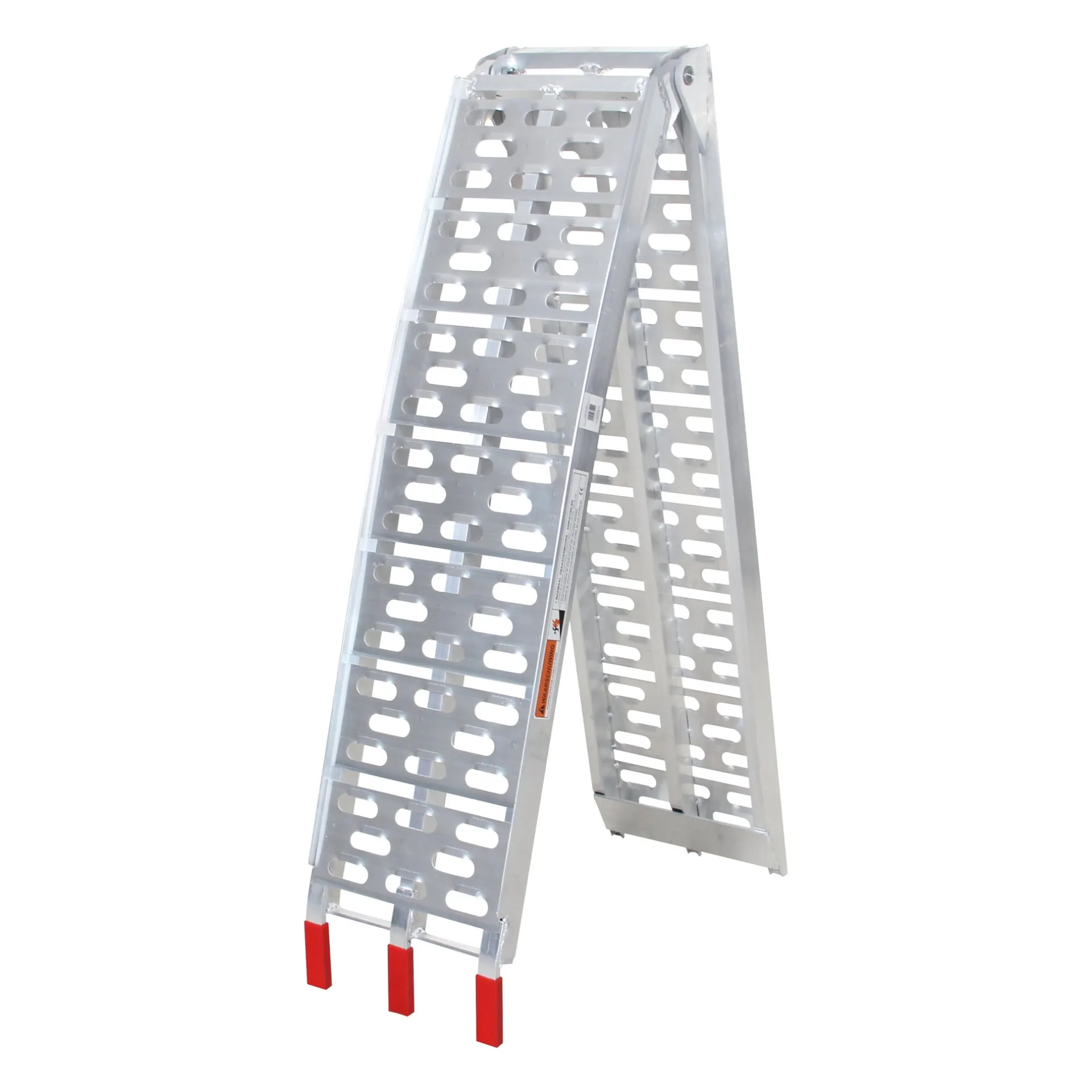Een dubbele, opvouwbare oprijplaat (220×29,5 cm) voor scooters, grasmaaiers en andere voertuigen met grote banden. Kan 340 kg per stuk dragen en is gemaakt van aluminium.