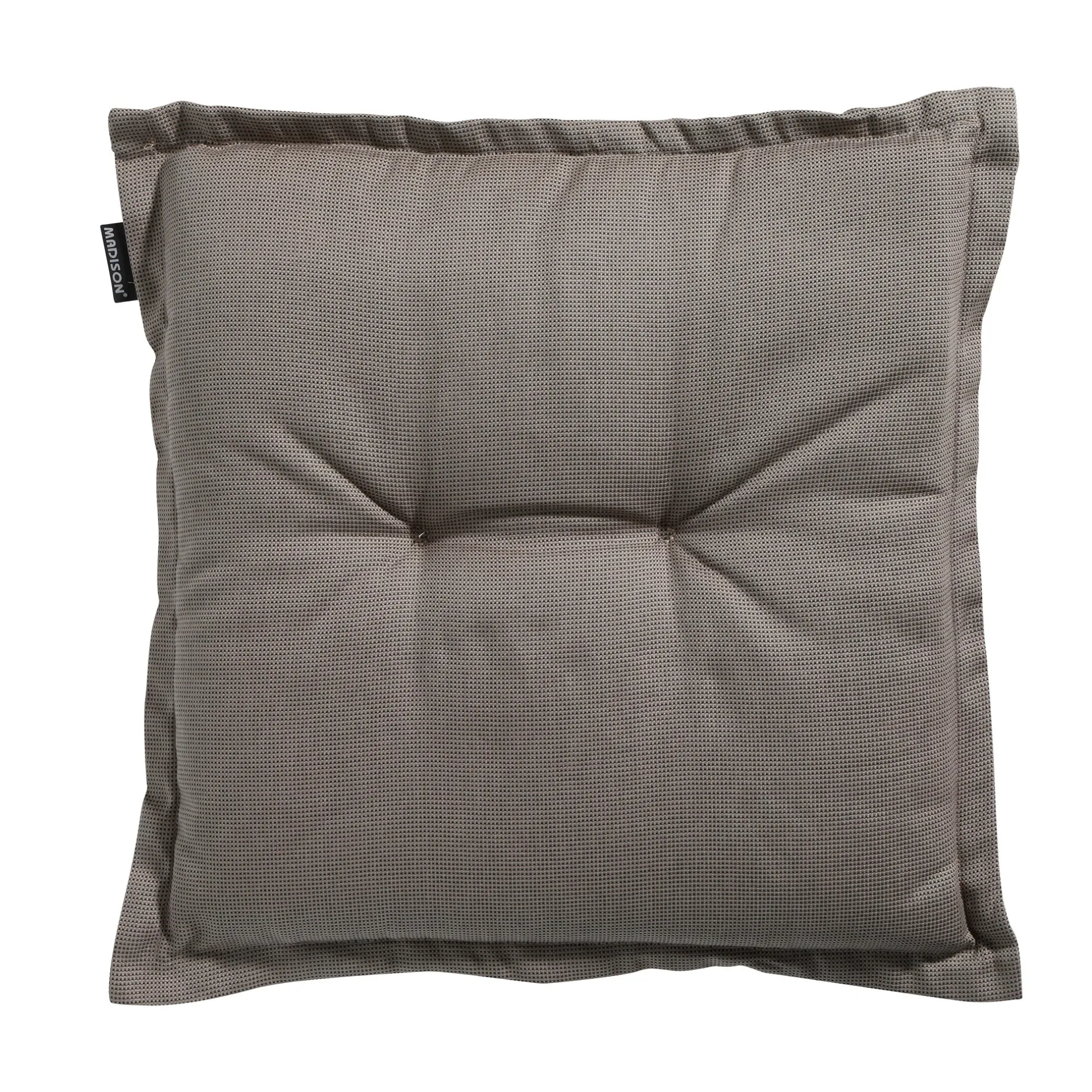 Rib Universeel zitkussen in de kleur taupe, 50 x 50 cm, vervaardigd uit 100% Acrylon. De ingenaaide knopen en volant zorgen voor een chique uitstraling. Dit kussen is slijtvast, ademend en kleurvast, en geschikt als zitkussen, rugkussen of poefkussen. Bovendien is het eenvoudig te onderhouden.