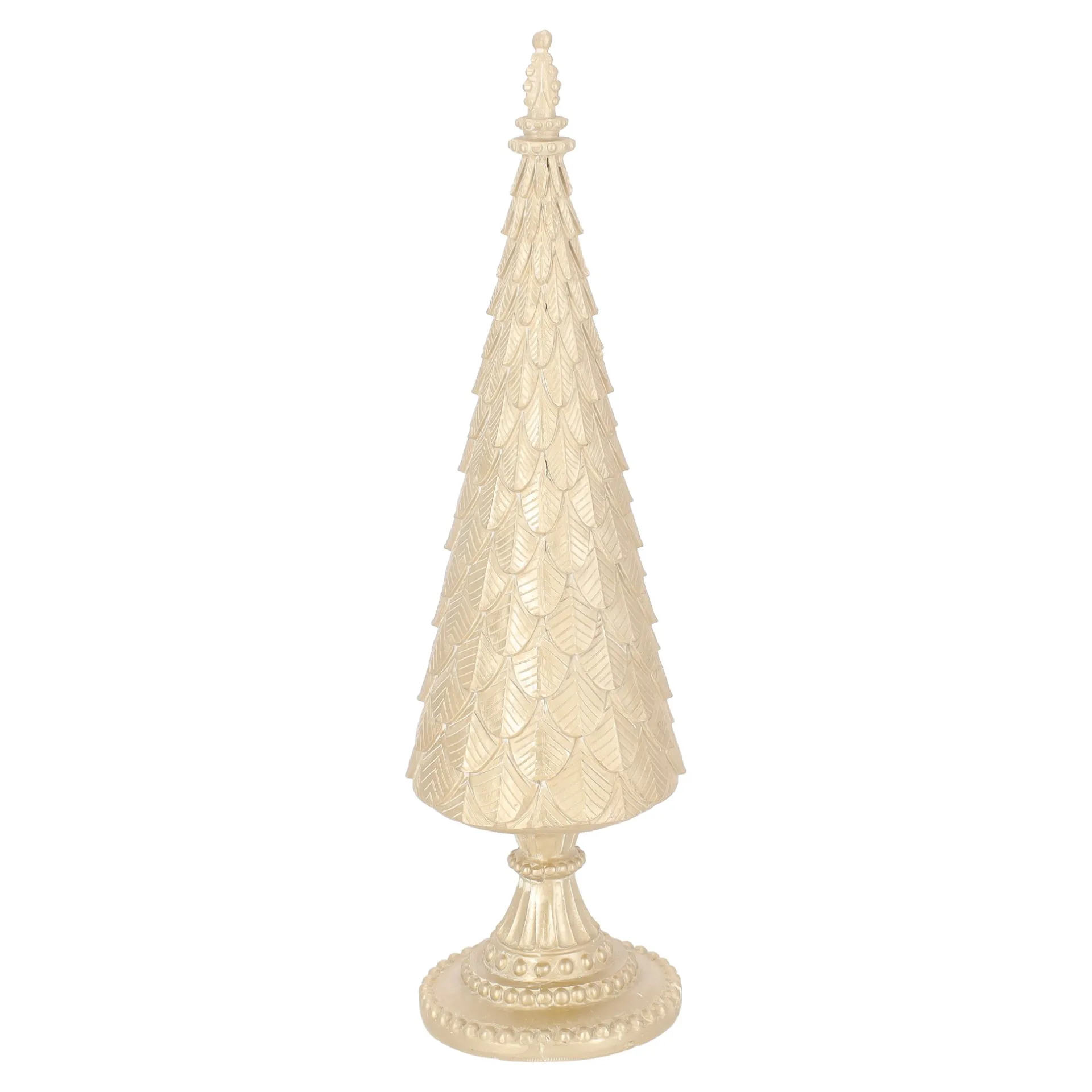 Goudkleurige staande kerstboom van 42 cm hoog op een sierlijke voet, geschikt als blikvanger op tafel, dressoir of vensterbank.