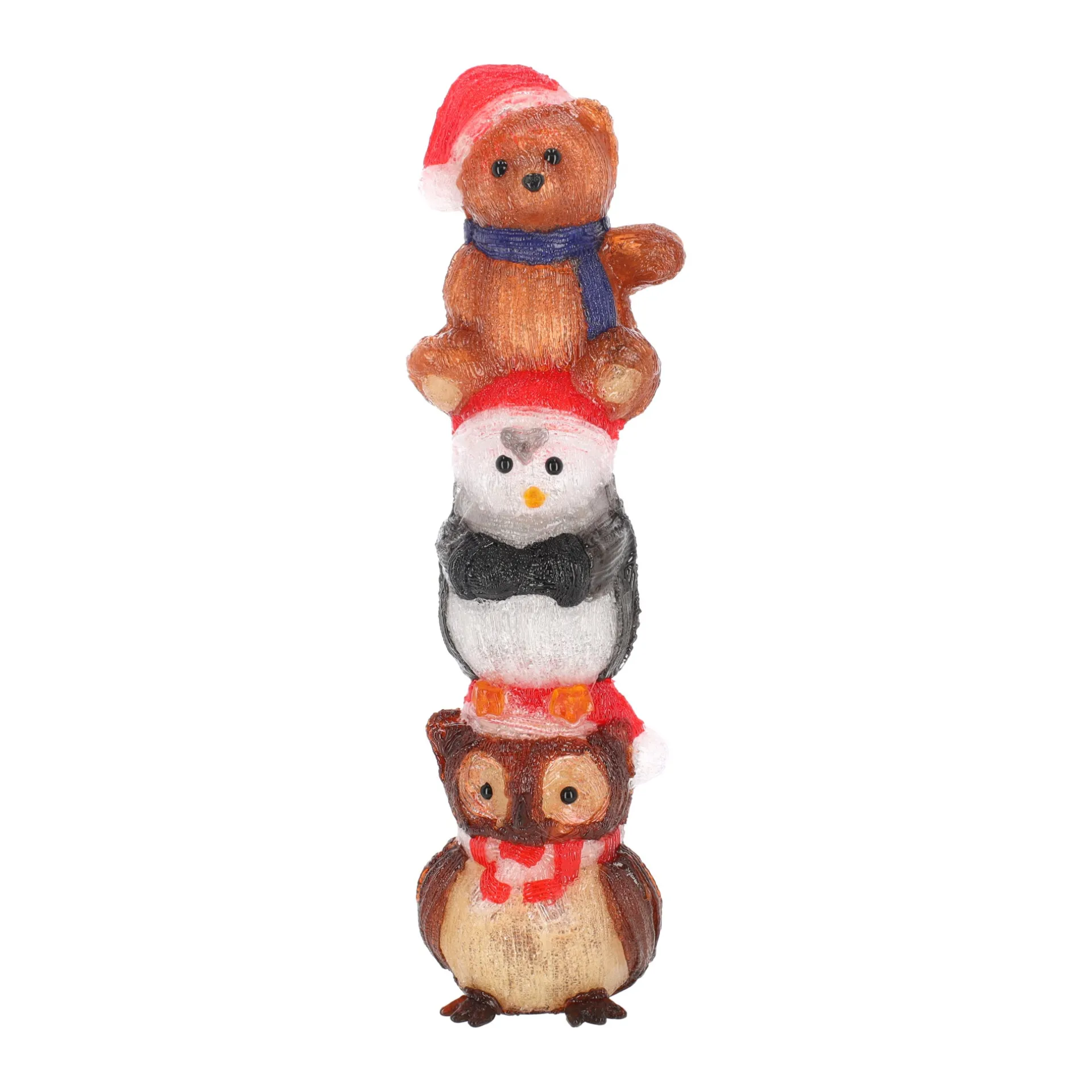 Deze speelse kerstfiguur toont een uil, pinguïn en beer die vrolijk op elkaar gestapeld zijn, allemaal met kerstmuts en sjaal, en zorgt meteen voor een gezellige kerstsfeer. De decoratie is gemaakt van acryl, is ongeveer 63 cm hoog en is voorzien van 80 geïntegreerde ledlampjes, zodat de details van de dieren mooi oplichten wanneer je de verlichting aanzet.