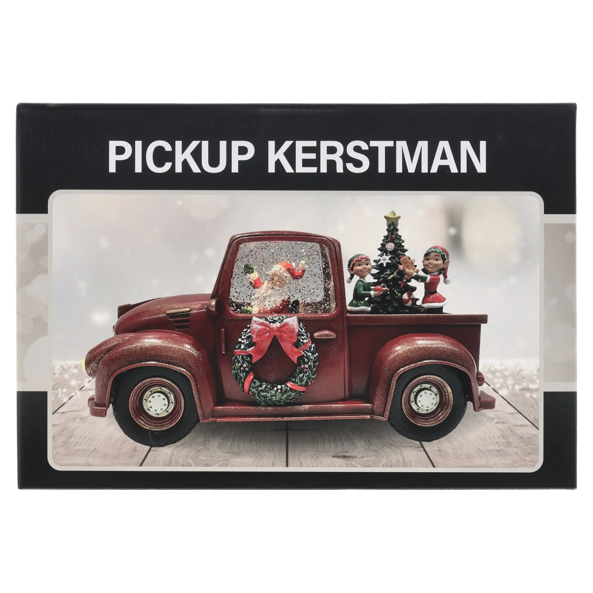 Deze rode kerstpickup zorgt meteen voor een vrolijke sfeer. In de cabine zit de kerstman, terwijl achterin twee elfjes rond een kerstboom met cadeautjes zitten, omringd door dwarrelende glitter als sneeuw. Een speelse blikvanger voor je kerstdecoratie.