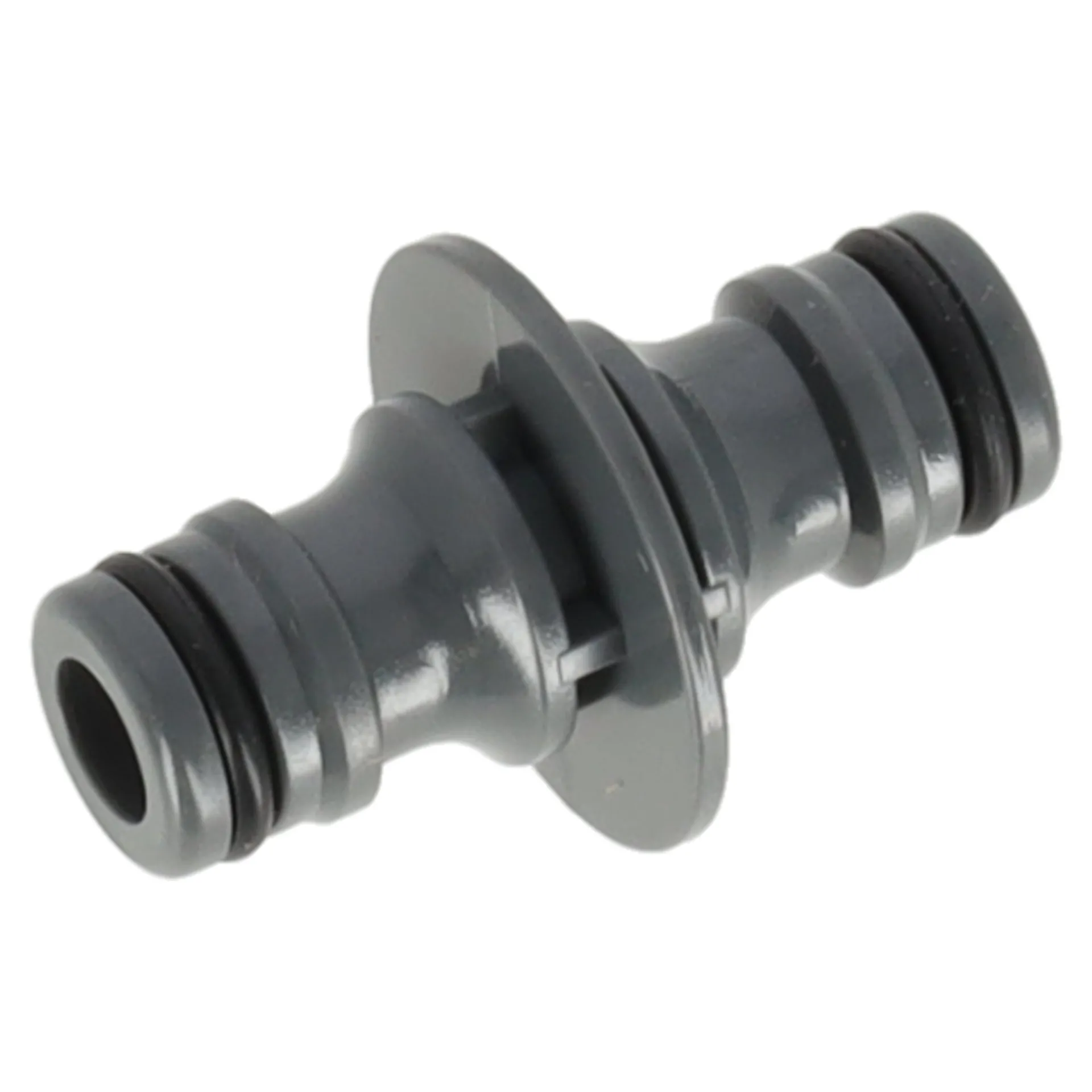 Een 2-weg koppeling om twee slangen aan elkaar te koppelen, handig voor verlenging of extra bereik in de tuin.