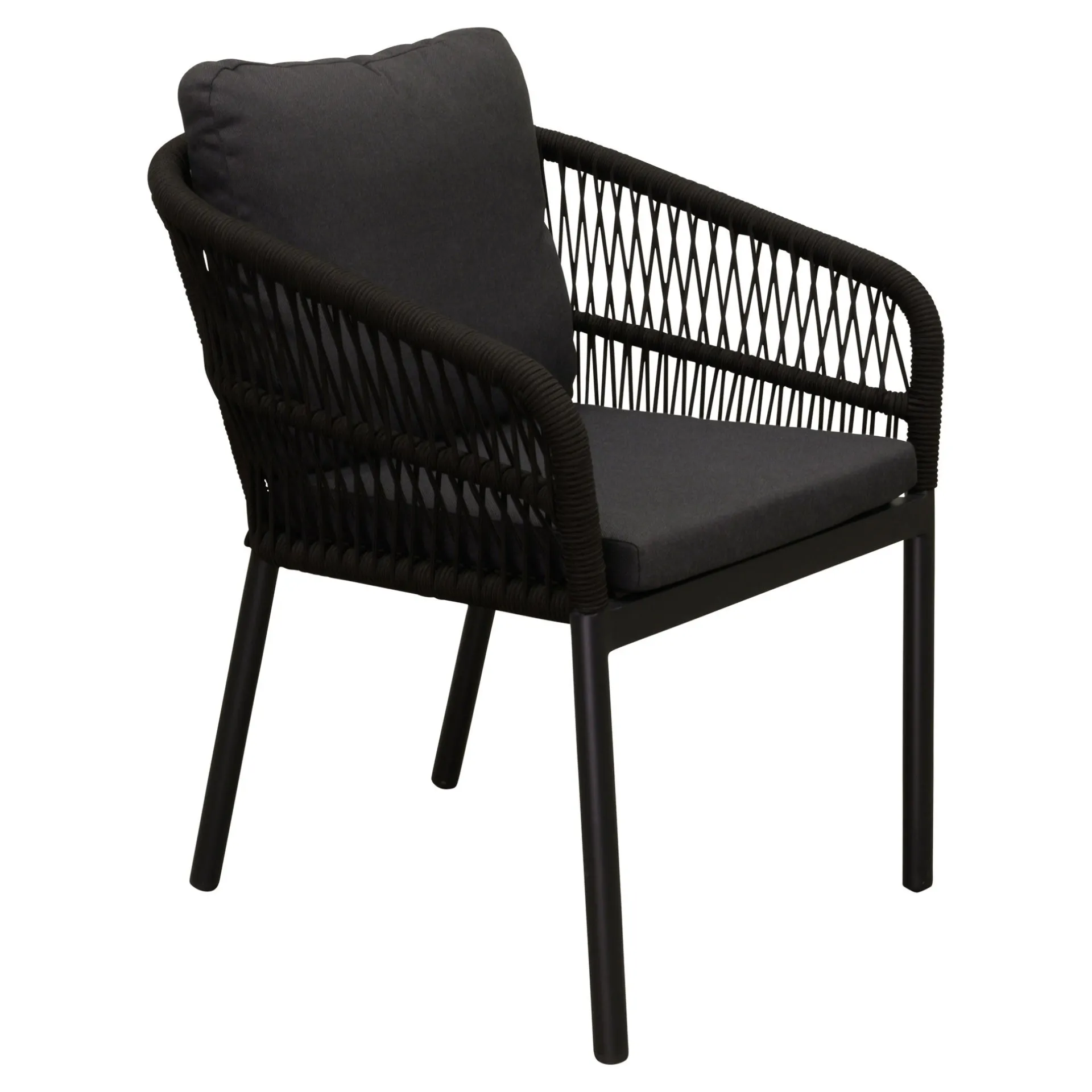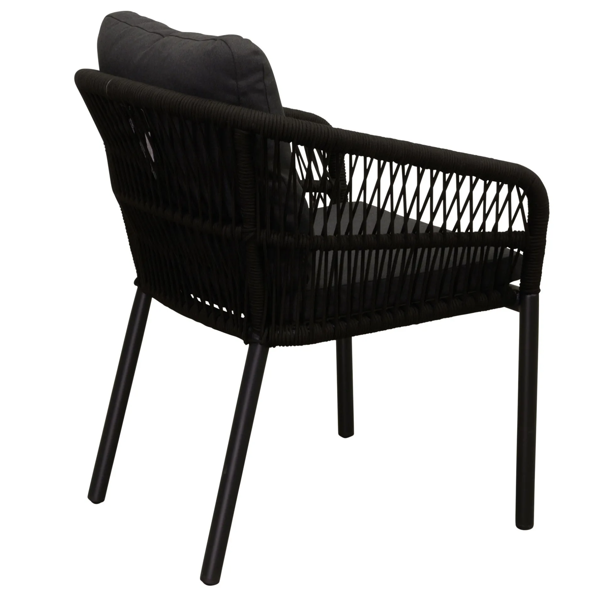 De stoel in zwart is een stijlvolle en comfortabele zitoplossing voor zowel binnen als buiten. Het aluminium frame zorgt voor een stevige en roestvrije basis, terwijl de rugleuning is afgewerkt met touw, wat de stoel een speelse en moderne uitstraling geeft. Het inclusief meegeleverde kussen biedt extra zitcomfort. Dankzij het moderne en minimalistische ontwerp past de stoel moeiteloos bij diverse interieur- en tuinsettings.