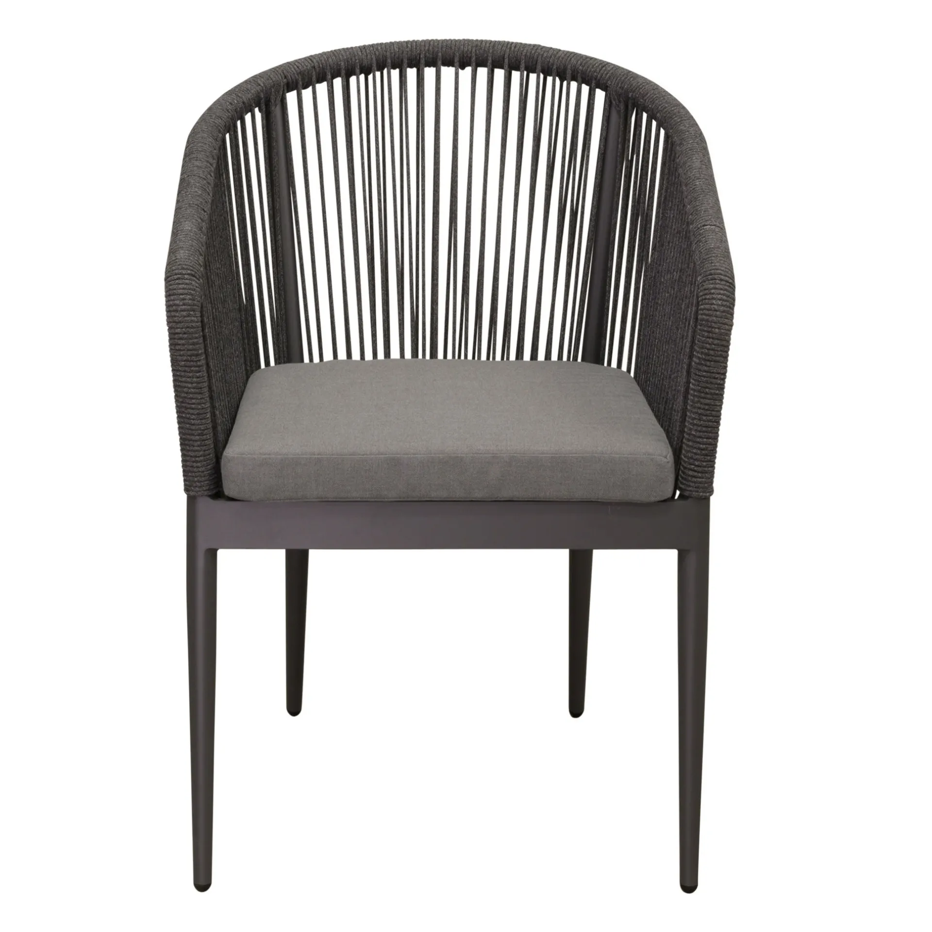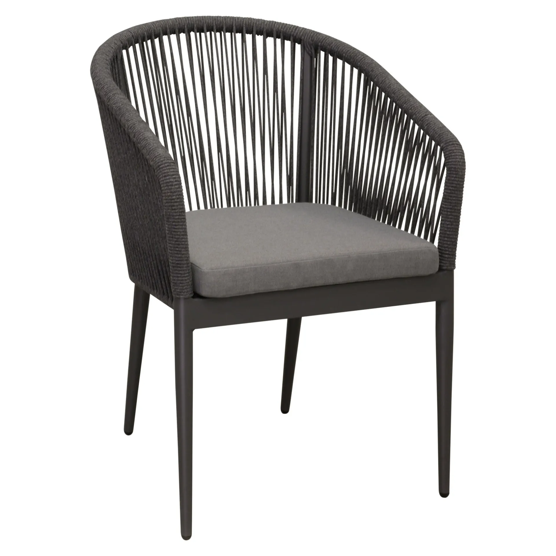 De stoel in antraciet is een stijlvolle en comfortabele zitoplossing voor zowel binnen als buiten. Het stevige aluminium frame is licht van gewicht en roestvrij, wat de stoel perfect maakt voor langdurig buitengebruik. De rugleuning is afgewerkt met touw, wat zorgt voor een decoratieve en eigentijdse uitstraling. Het meegeleverde kussen biedt extra zitcomfort. Dankzij het moderne en minimalistische ontwerp past de stoel moeiteloos bij diverse interieur- en tuinsettings.