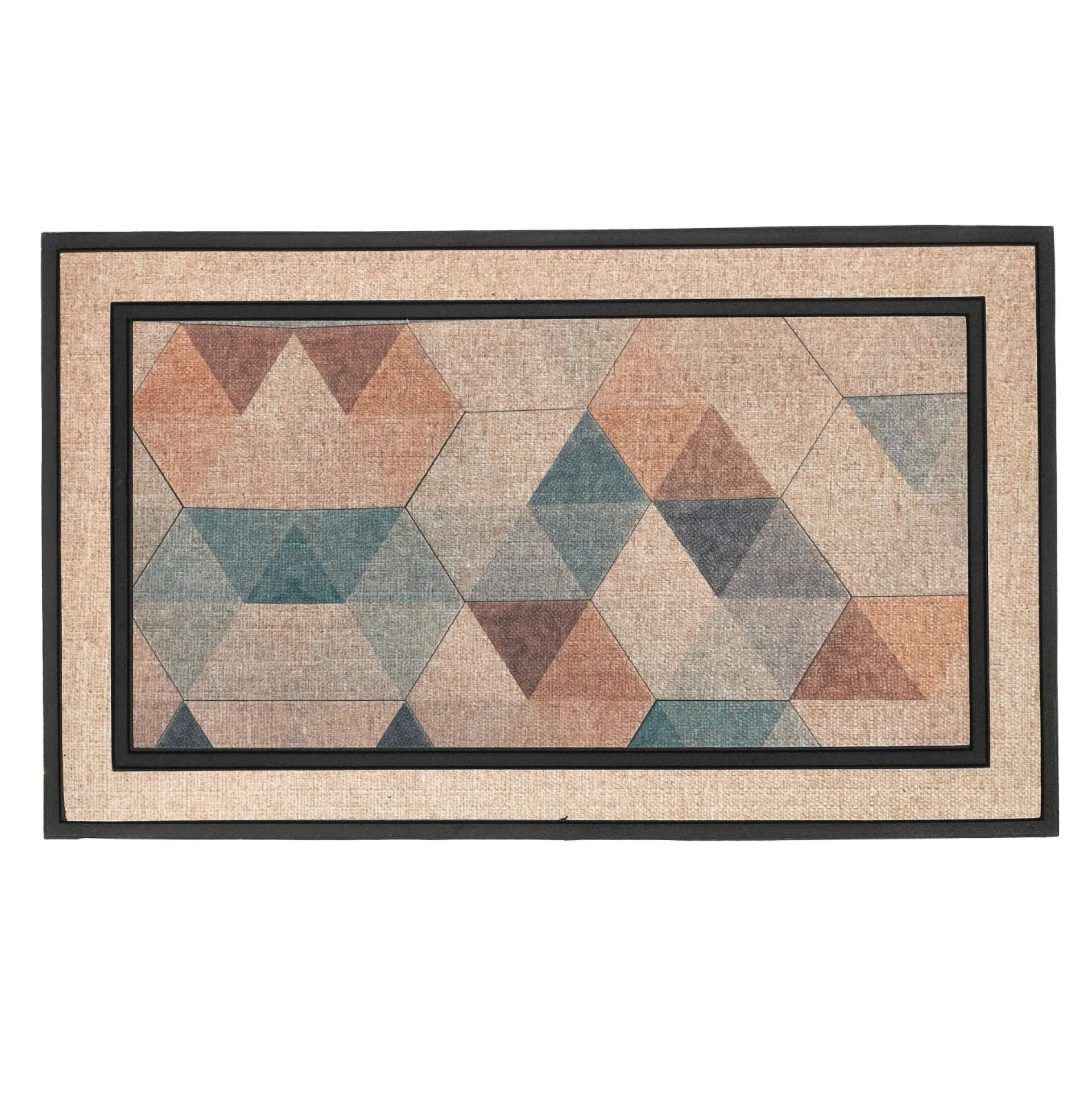 Deurmat met beige ondergrond en driehoekig dessin in zachte, gemêleerde kleuren, afgewerkt met een donkere rand.