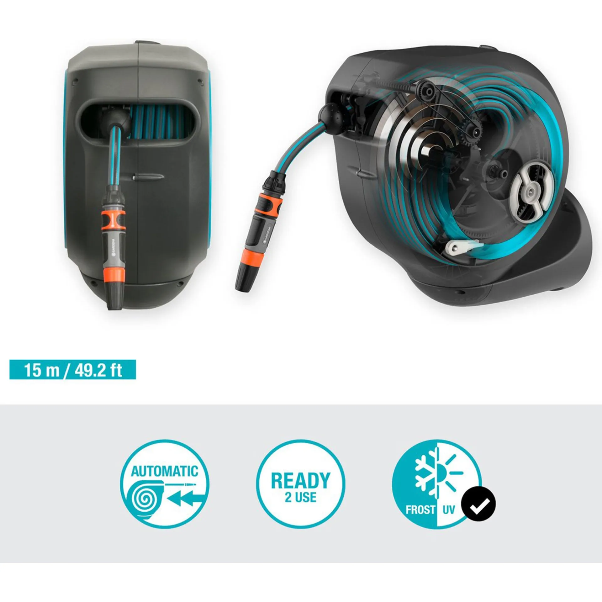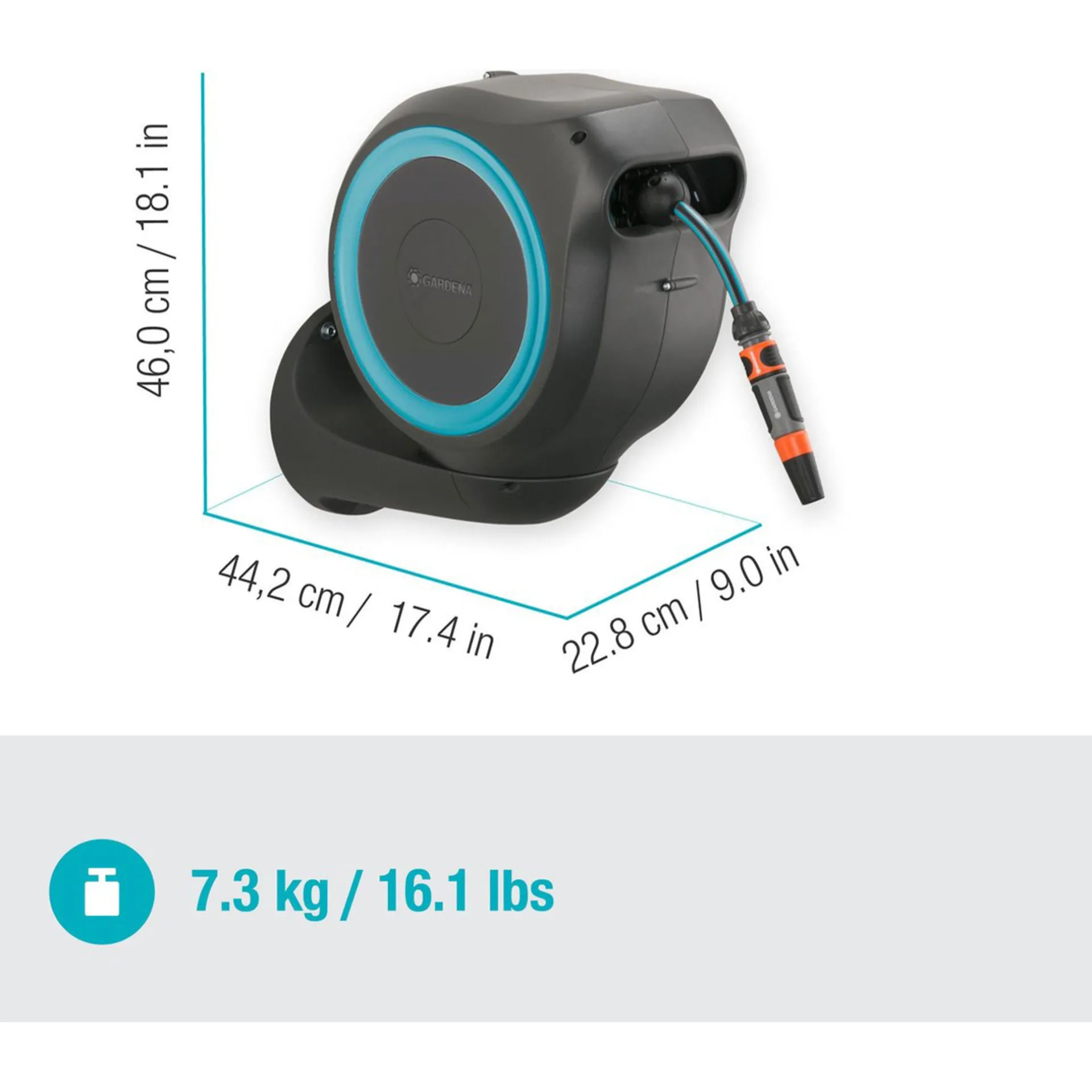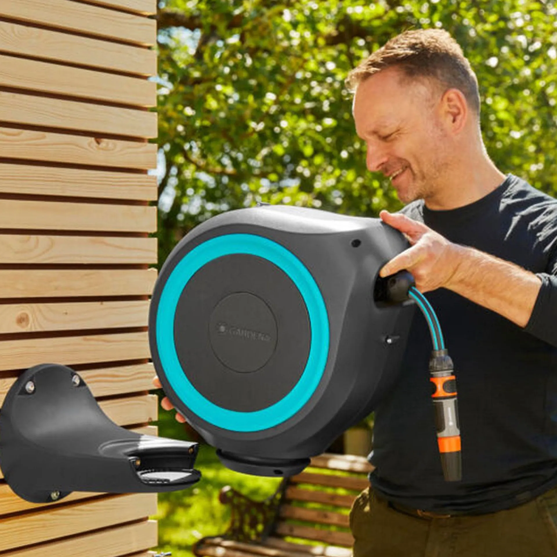 De Gardena Wandslangenbox RollUp S 15 m maakt tuinieren eenvoudiger en netter. De slang kan eenvoudig tot 15 meter worden uitgerold en vergrendelt automatisch bij elke stop. De stevige muurbeugel draait meer dan 180 graden, zodat je elke hoek van de tuin bereikt. Dankzij de RollControl-technologie rolt de slang soepel en gecontroleerd op.