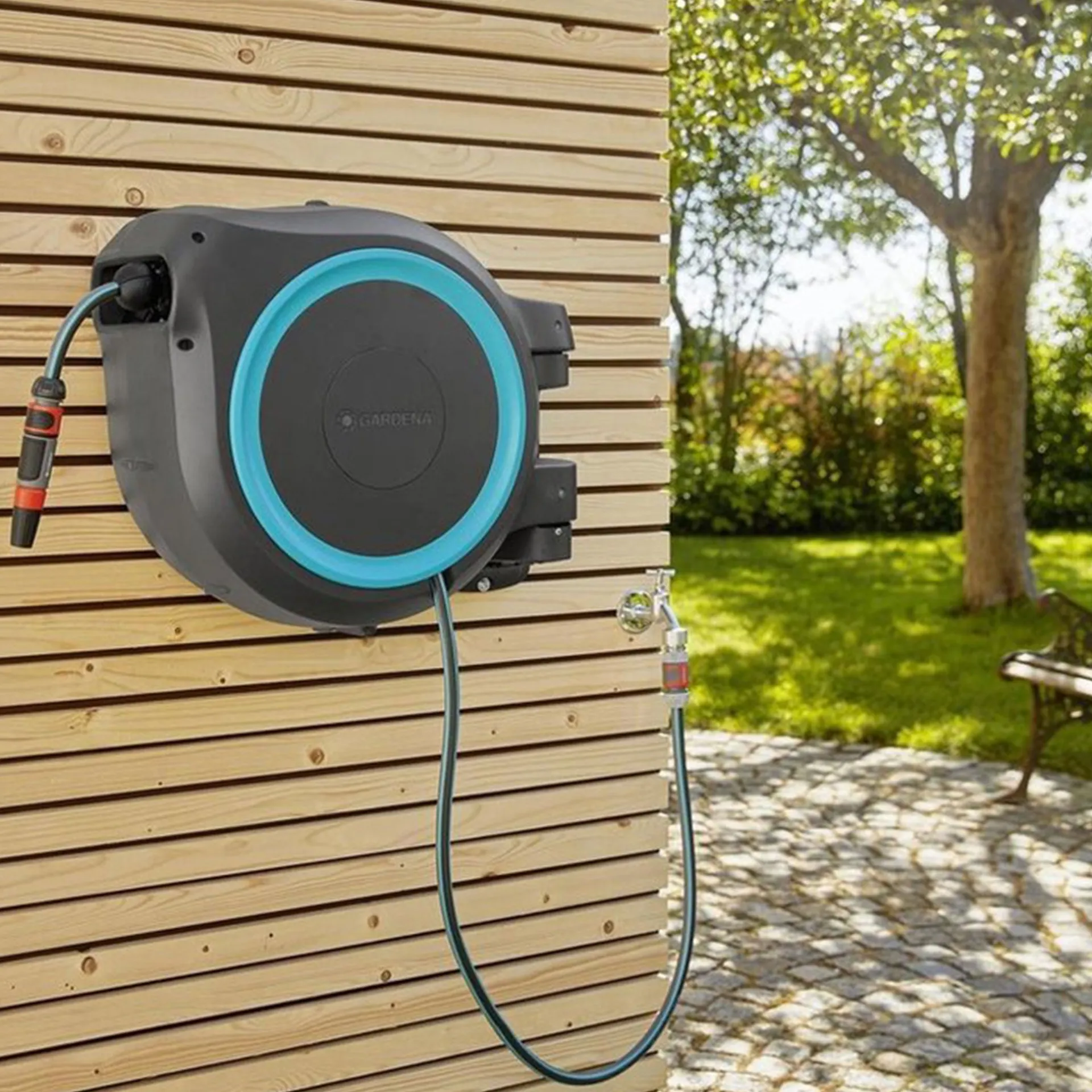 De Gardena Wandslangenbox RollUp XL 35 m maakt tuinbewatering eenvoudig. De slang rolt automatisch op, blijft schoon en raakt niet in de knoop. De 35 meter lange slang kan tot de gewenste lengte worden uitgerold en blijft vast door de vergrendelingspunten. De slangenhouder draait 180 graden met de muurbeugel, zodat hij je bewegingen volgt.