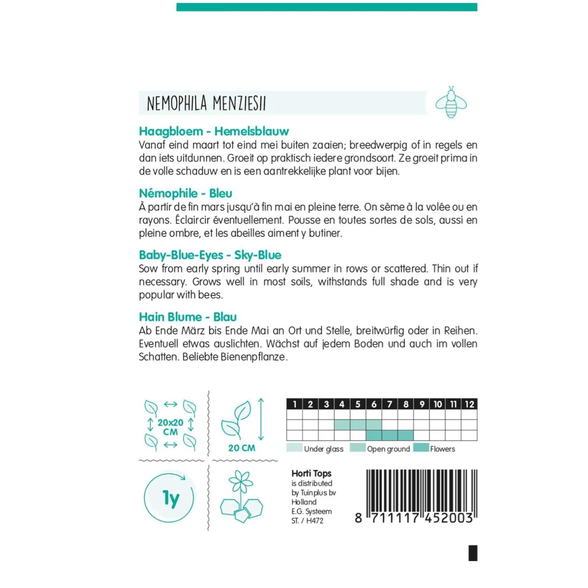 Nemophila kan vanaf eind maart tot eind mei buiten gezaaid worden; breedwerpig of in regels en dan iets uitdunnen. Groeit op praktisch iedere grondsoort. Ze groeit prima in de volle schaduw en is een aantrekkelijke plant voor bijen.