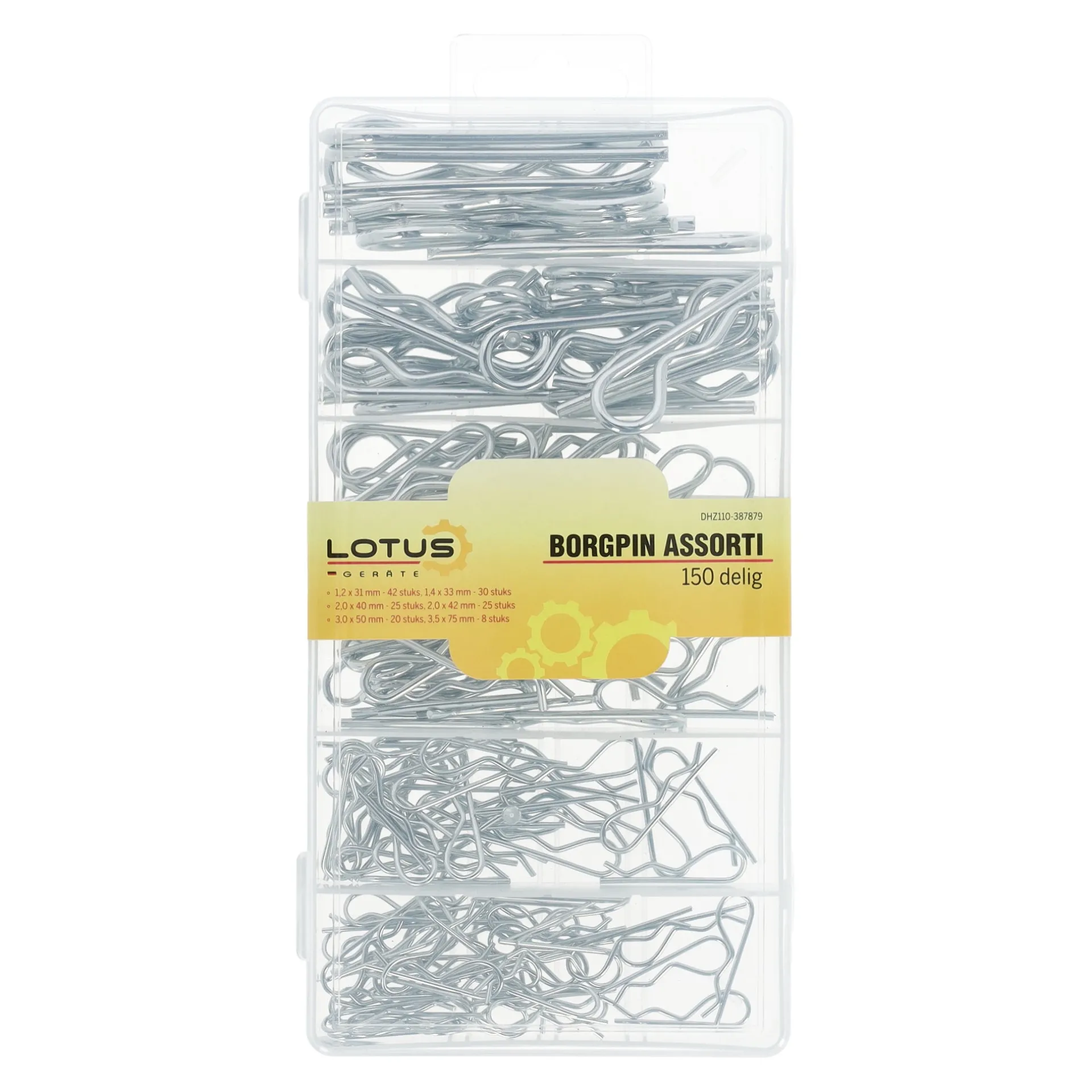 In deze borgpin set van Lotus zitten 150 borgpennen in meerdere maten, overzichtelijk gesorteerd in een transparante opbergdoos met vakverdeling.