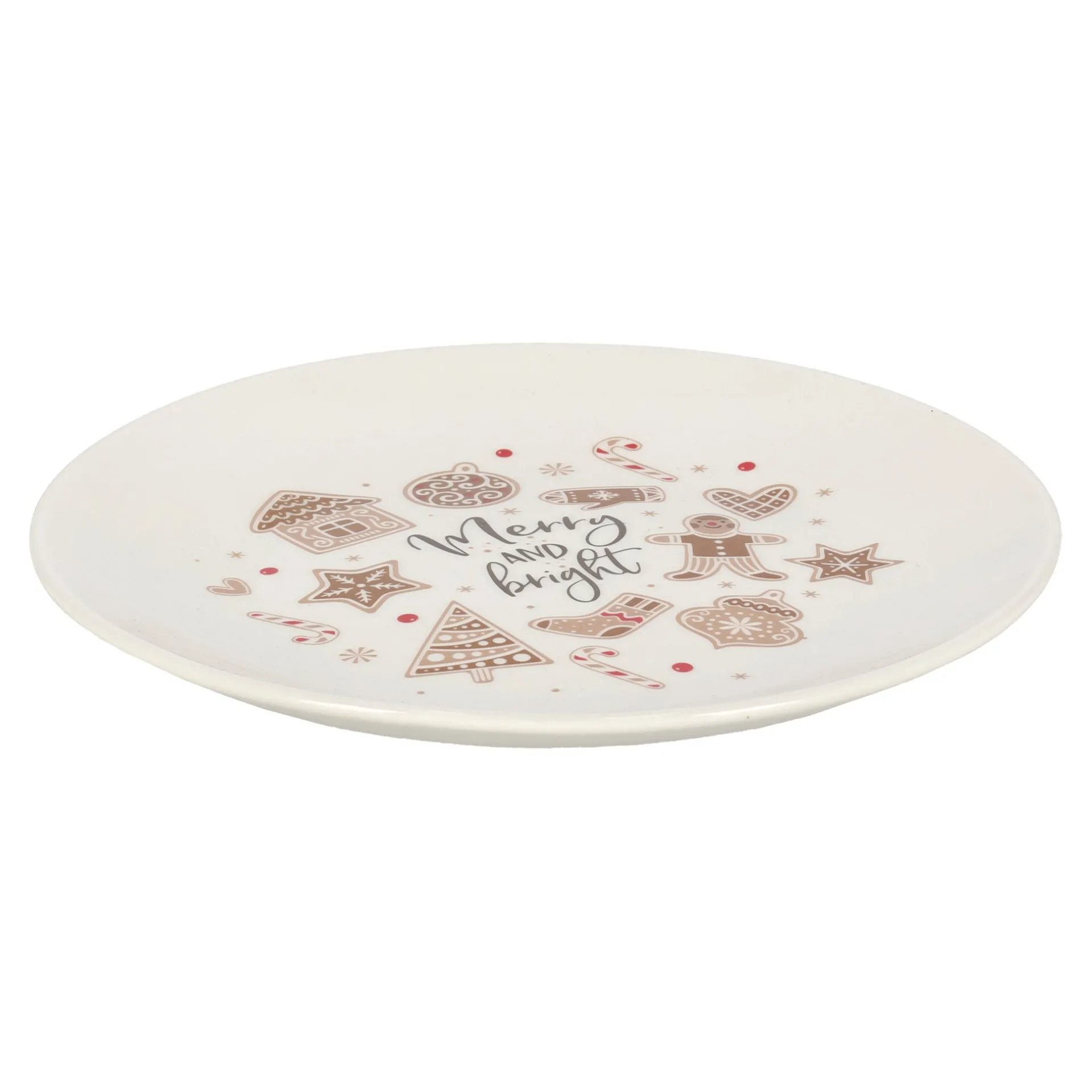 Dit ronde bord van 19 cm is versierd met gezellige kerstmotieven zoals peperkoekfiguren, kerstboompjes en zuurstokken. In het midden staat de tekst “Merry and bright”. Perfect voor gebak of snacks tijdens de feestdagen. Gemaakt van keramiek en eenvoudig schoon te maken.