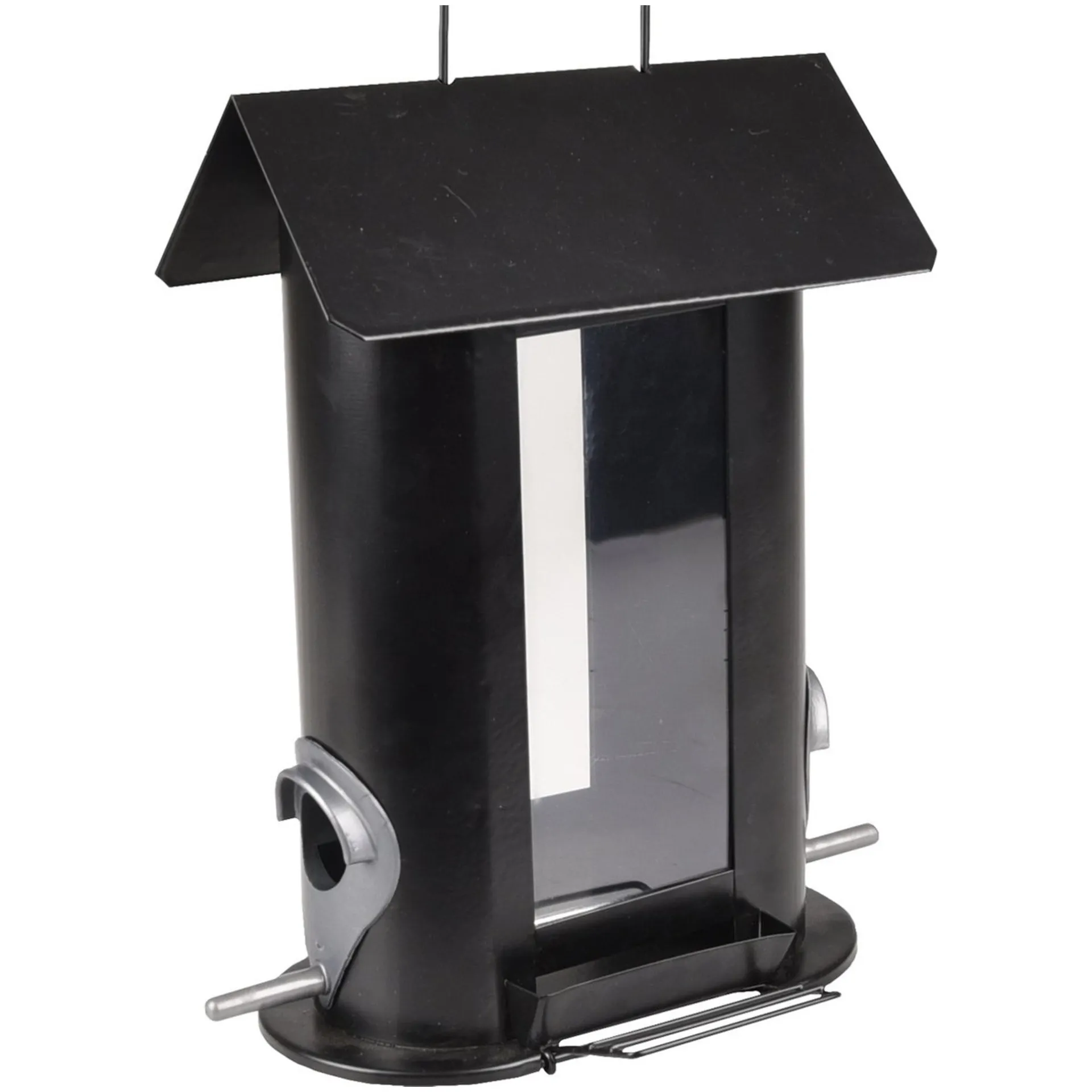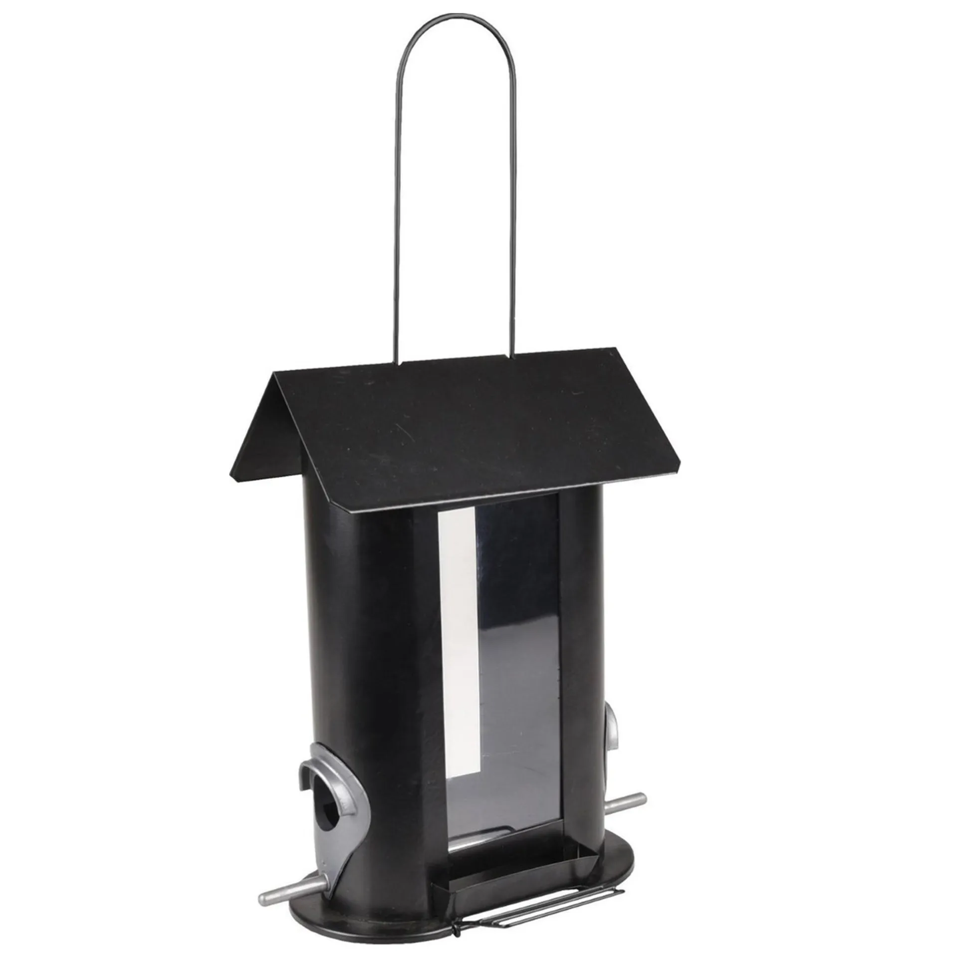 Zwarte metalen vogelvoederhuis met transparant reservoir en meerdere zitstokken. Eenvoudig op te hangen en bij te vullen met vogelvoer.