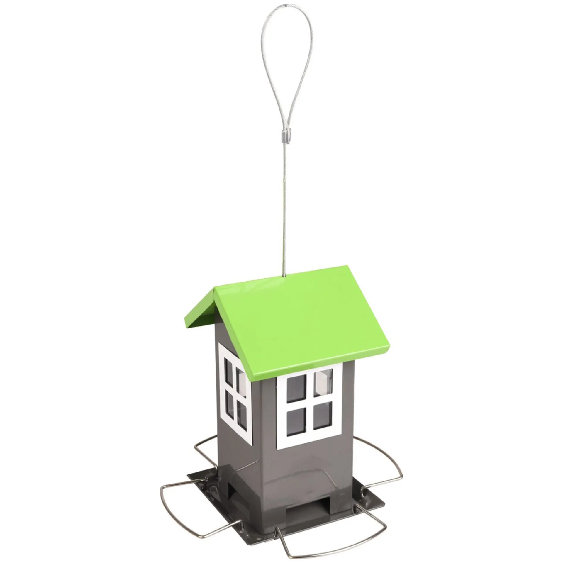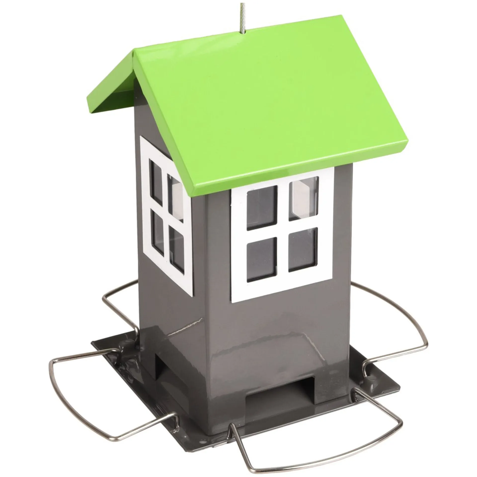 Metalen vogelvoederhuis in de vorm van een huisje met grijs lichaam en groen dak. Voorzien van zitringen rondom en eenvoudig op te hangen.