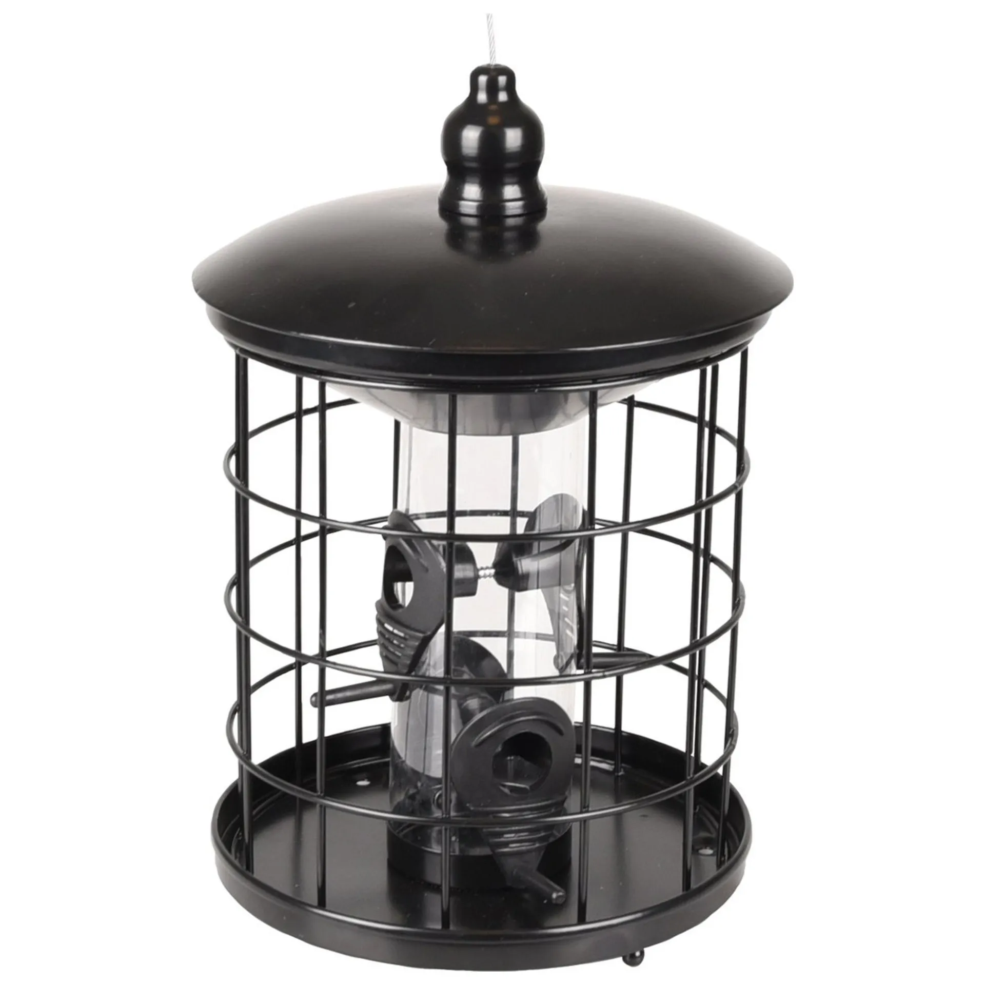 Zwarte metalen vogelvoedersilo met beschermkooi en transparant reservoir. Geschikt voor zaden en eenvoudig op te hangen.