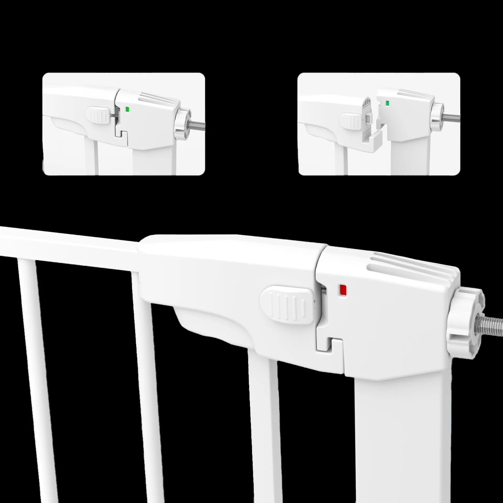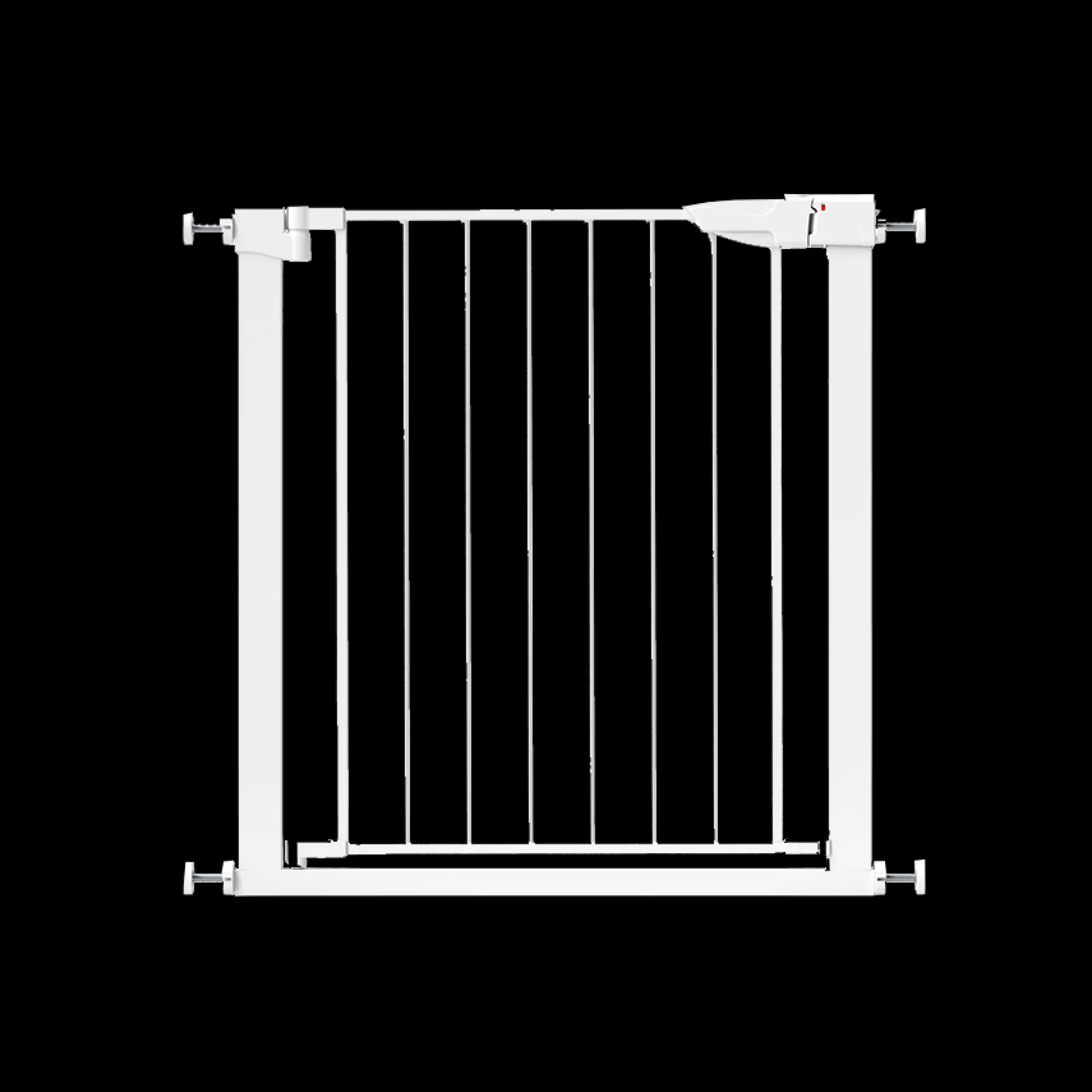 Veiligheidshek met verticale spijlen en verstelbare drukbevestiging. Uitgerust met een vergrendelsysteem aan de bovenzijde en geschikt voor plaatsing in deuropeningen of bij trappen. Naar wens kan het hekje gemonteerd worden met of zonder schroeven. Geschikt voor deuropeningen van 75-82 cm.