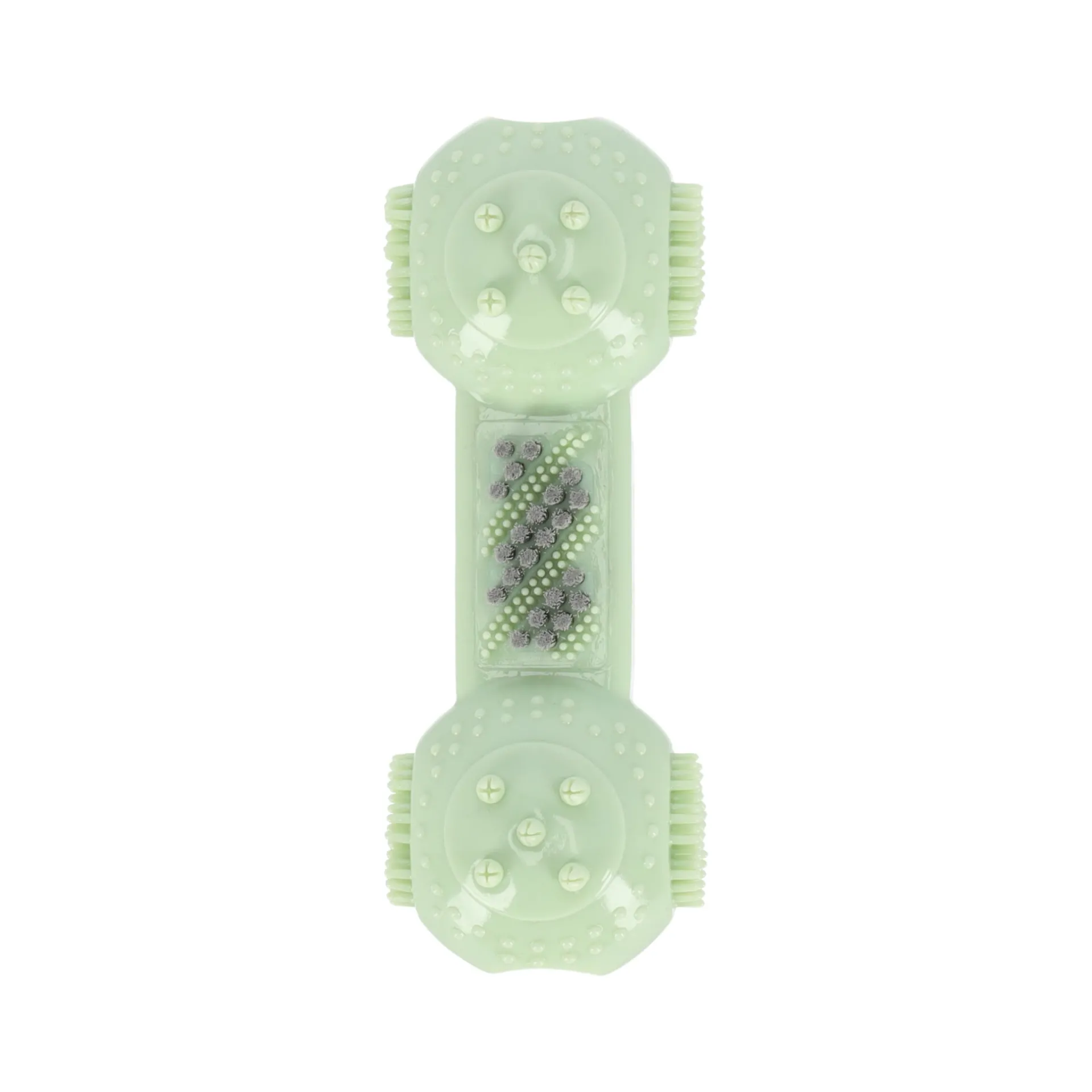 De is een stevig en veelzijdig kauwspeeltje, perfect voor middelgrote honden. Deze halter is gemaakt van thermoplastisch rubber (thermoplastisch rubber), een duurzaam en flexibel materiaal dat bestand is tegen intensief kauwen. Het ontwerp met textuur zorgt voor een goede grip, terwijl het kauwen op de halter helpt om de tanden schoon te houden en het tandvlees te masseren.