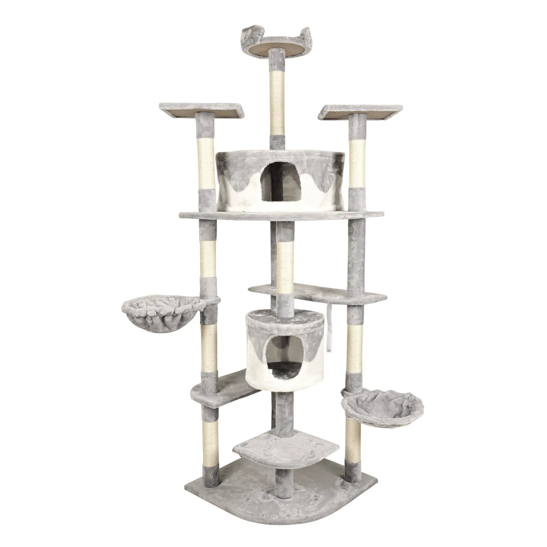Ruime krabpaal met meerdere huisjes, ligplateaus en zachte hangmanden. Biedt volop mogelijkheden om te klimmen, rusten, spelen en krabben. Perfect voor meerdere katten en helpt meubels beschermen tegen krabschade.