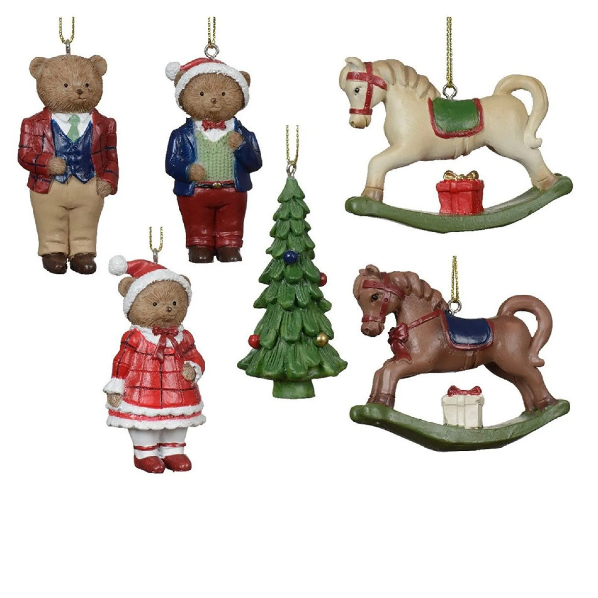 Kersthanger van polyresin van 7cm met verschillende figuren zoals beren, kerstbomen en hobbelpaardjes. De klassieke stijl en warme kleuren geven een nostalgische uitstraling aan je kerstdecoratie.