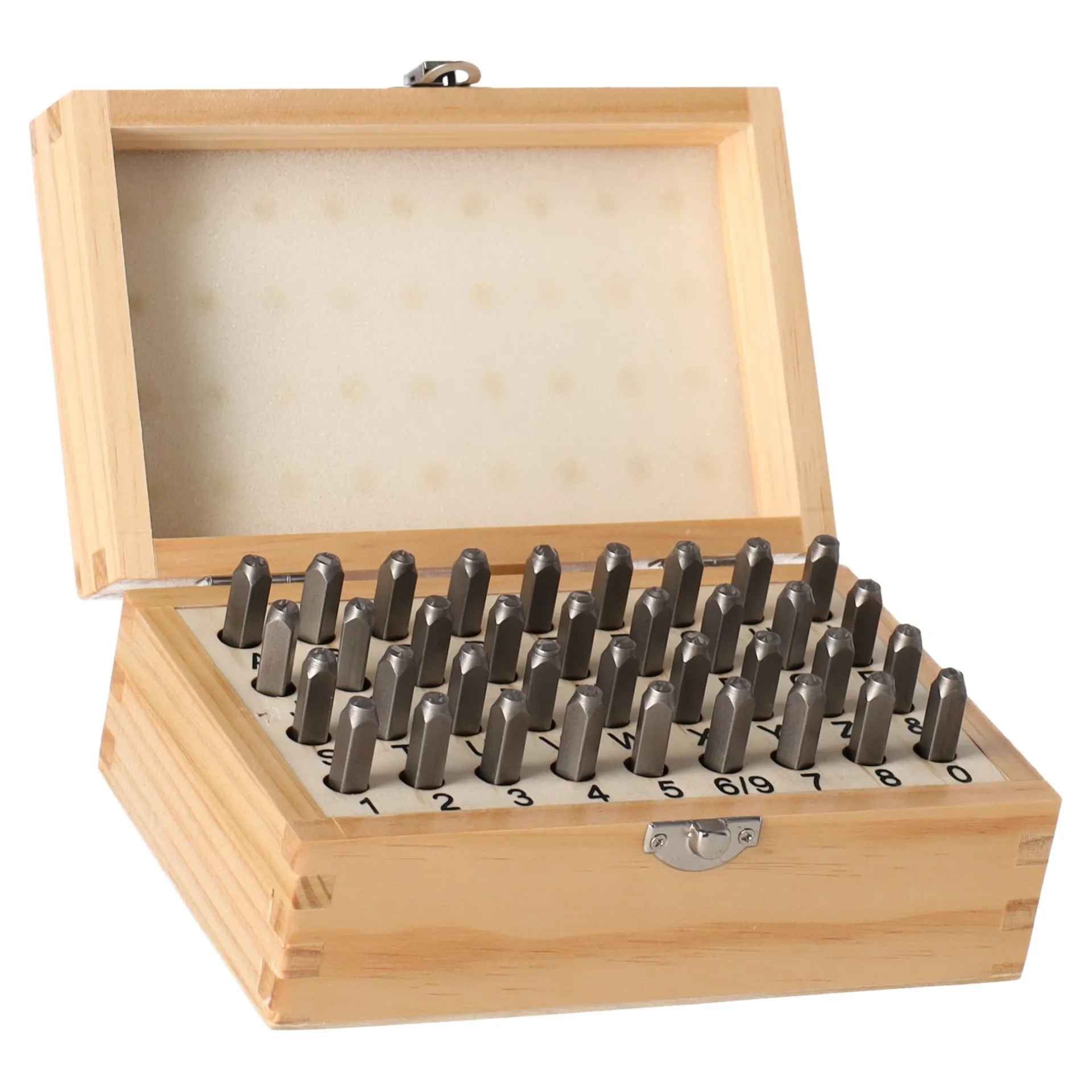 Set stempels met letters (A-Z) en cijfers (0-9) van 4 mm, ideaal voor reliëfdruk op metaal, leer en andere materialen. Verpakt per 36 stuks.