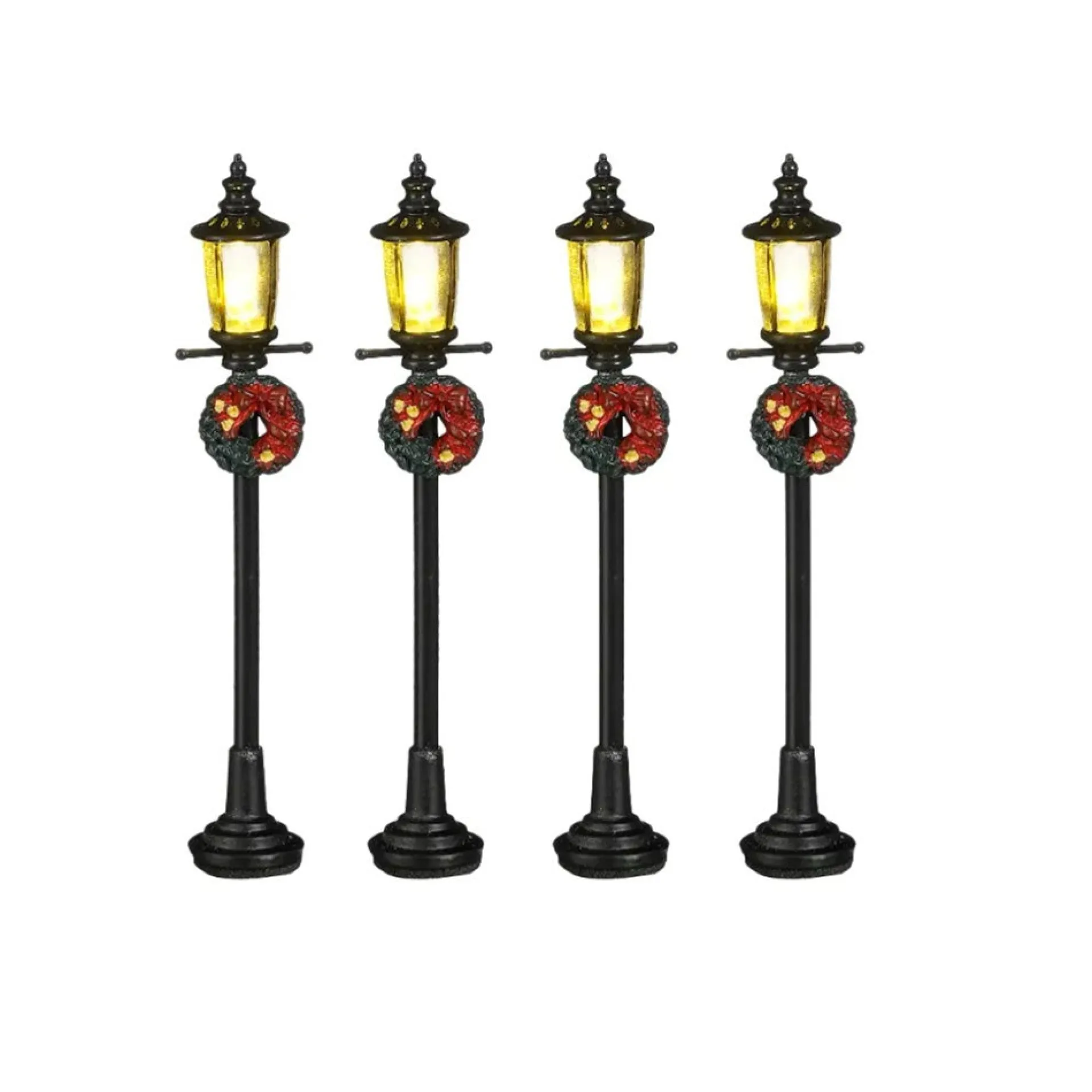 Set van vier klassieke lantaarns voor je kerstdorp, zorgen ze voor sfeervolle verlichting langs straten, pleinen of bij gebouwen in je miniatuurlandschap.