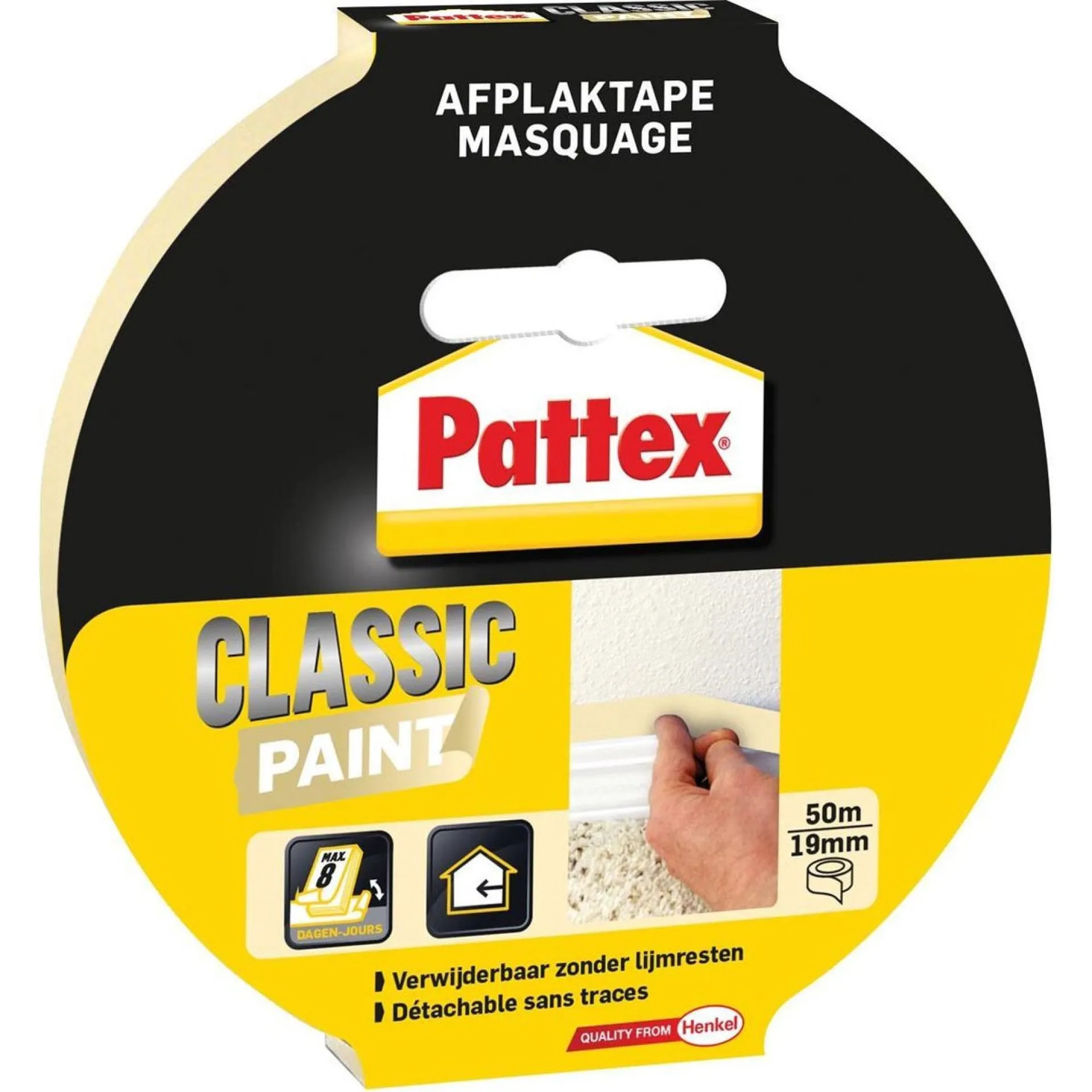 Pattex Afplaktape Verf is een sterke, schone tape voor strakke verflijnen. Geschikt voor binnen en buiten, laat geen lijmresten achter tot 8 dagen.