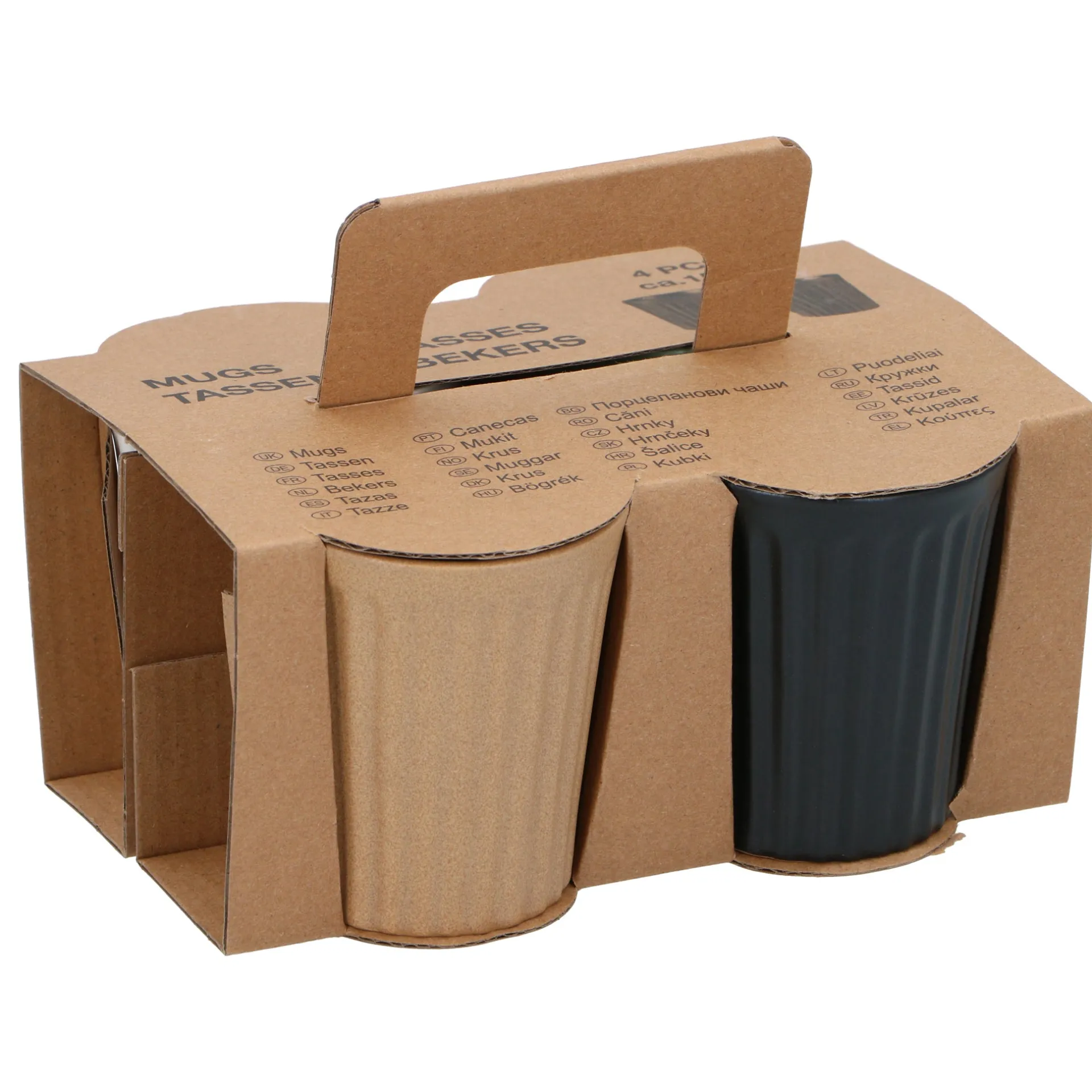 Een set van 4 robuuste mokken in diverse kleuren, ideaal voor het drinken van warme dranken zoals koffie, thee, of chocolademelk.