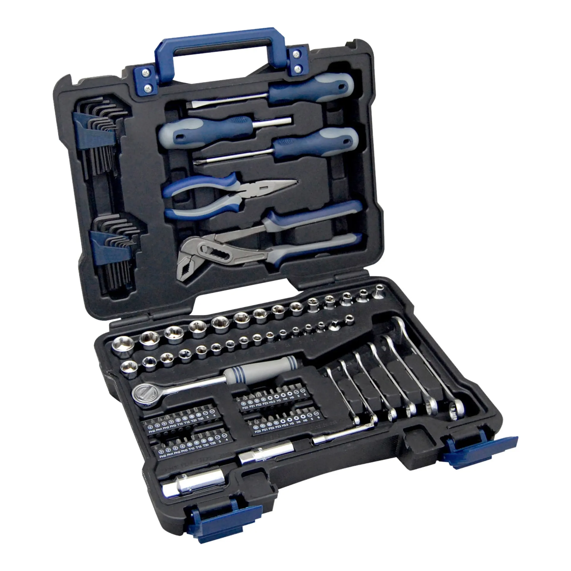 Een compleet uitgeruste gereedschapskoffer is een must-have voor professionals en doe-het-zelvers. De inhoud is overzichtelijk georganiseerd met aparte vakken in de bodem en het deksel, waardoor alle tools netjes op hun plek blijven liggen. Dit maakt het eenvoudig om snel het juiste gereedschap te vinden en na gebruik op de juiste plek terug te leggen.