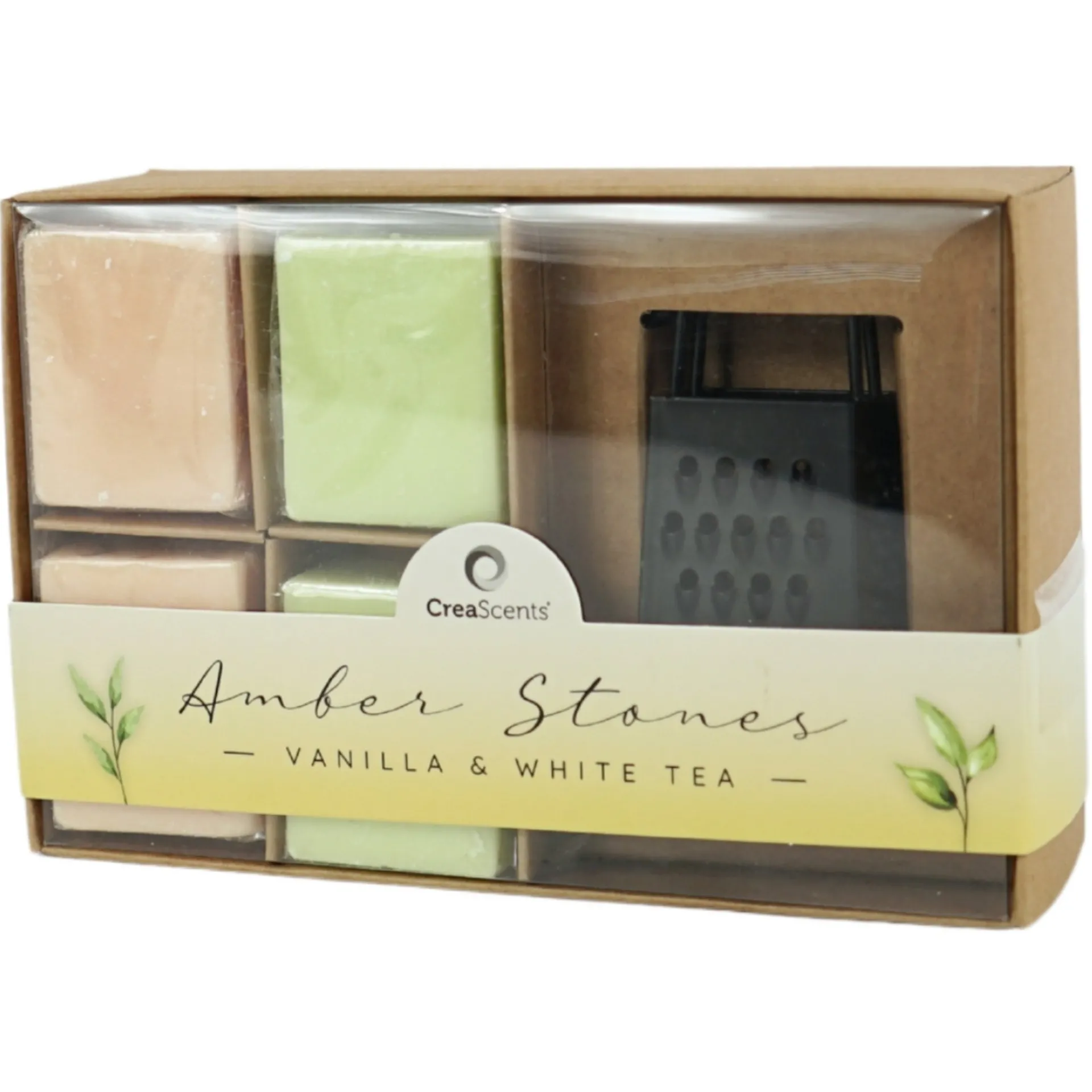 Set van vier amberblokjes met een handige rasp. Verkrijgbaar in drie varianten en ideaal om een heerlijke geur in huis te verspreiden.