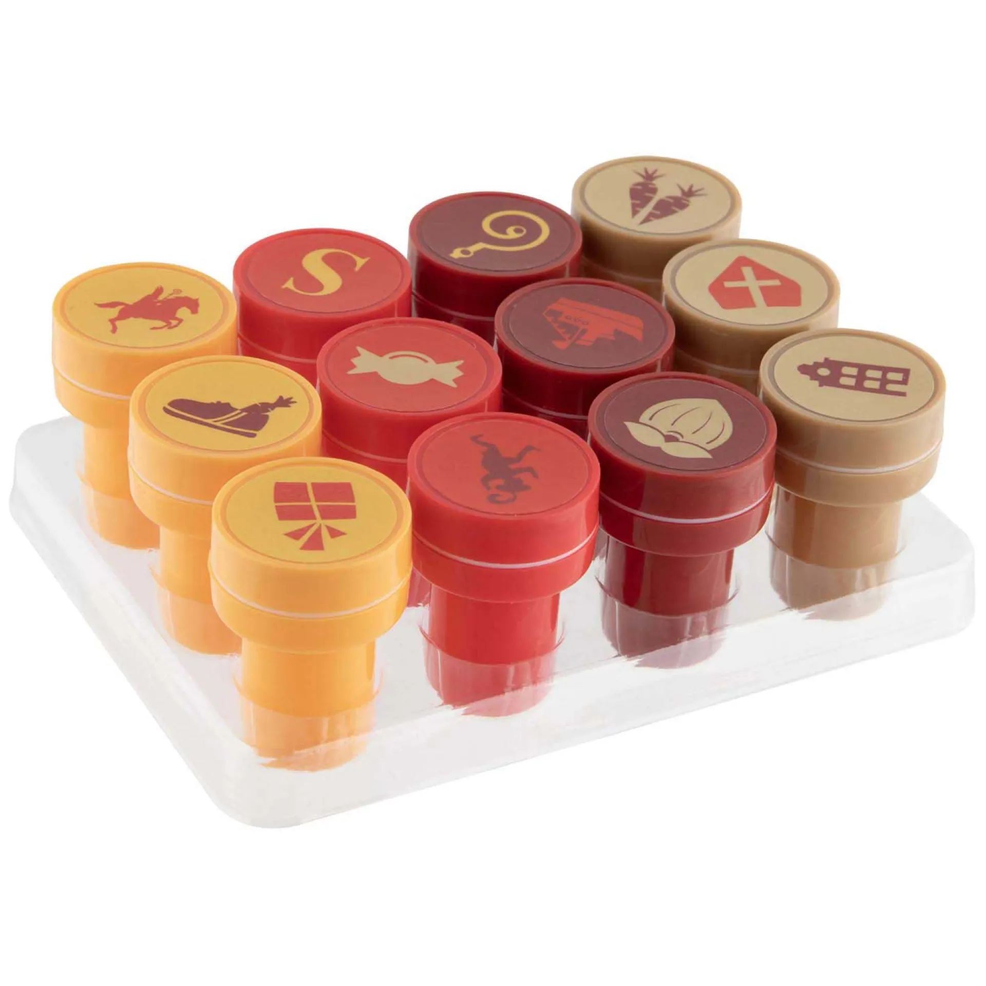 Stempelset met 12 vrolijke Sinterklaasstempels. De set bevat verschillende afbeeldingen van Sint, Pieten en feestelijke symbolen. Leuk om tekeningen, kaarten of cadeaulabels mee te versieren. Geschikt voor kinderen vanaf 3 jaar.