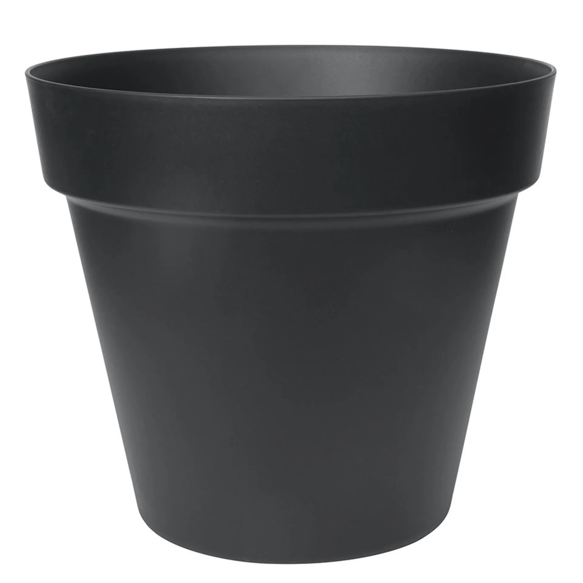 Deze zwarte plantenpot heeft een eenvoudige rechte vorm met een brede rand aan de bovenkant. De pot is gemaakt van kunststof en is geschikt voor verschillende soorten planten.