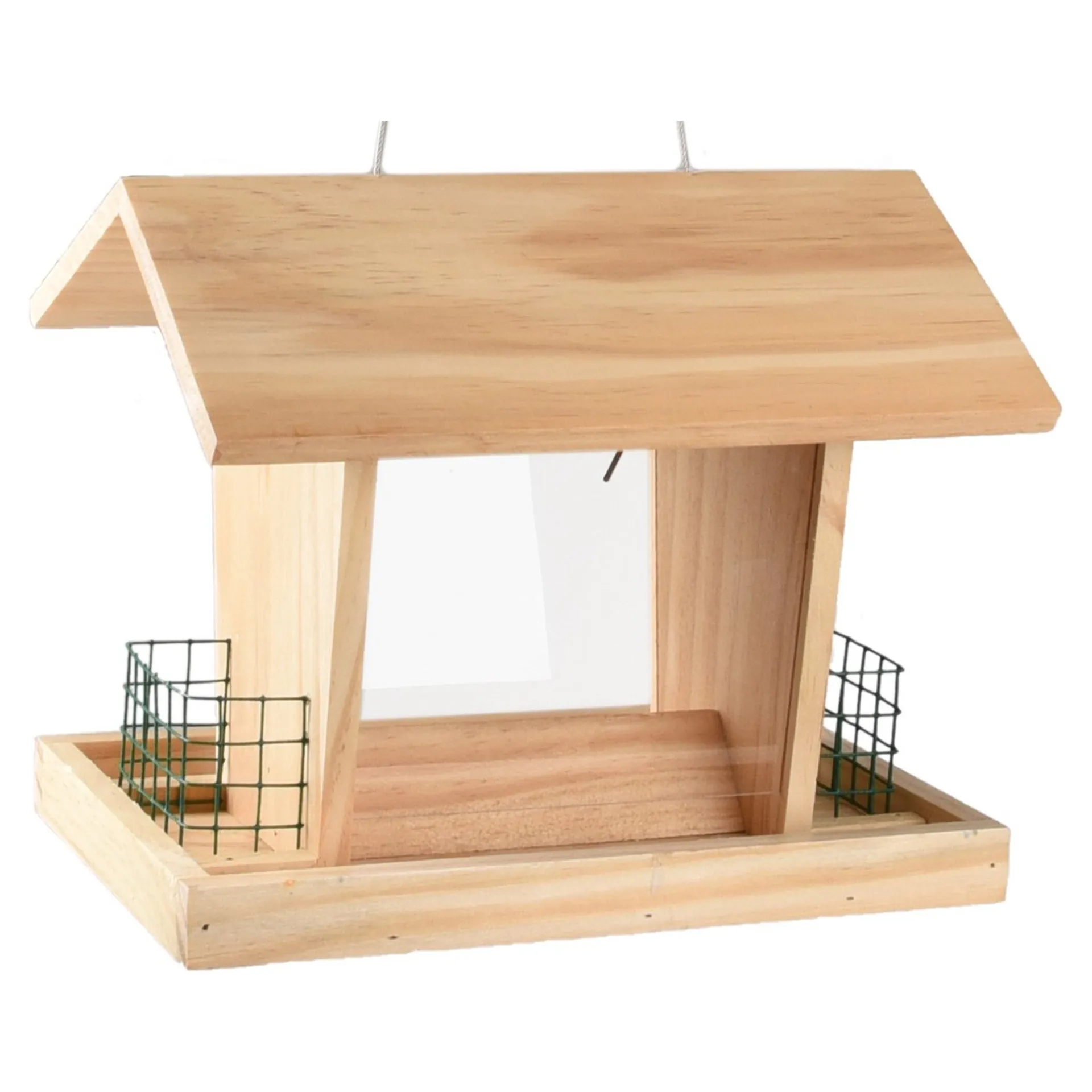 Houten vogelvoederhuis met zadeldak en twee metalen houders voor vetbollen. Eenvoudig op te hangen en bij te vullen.