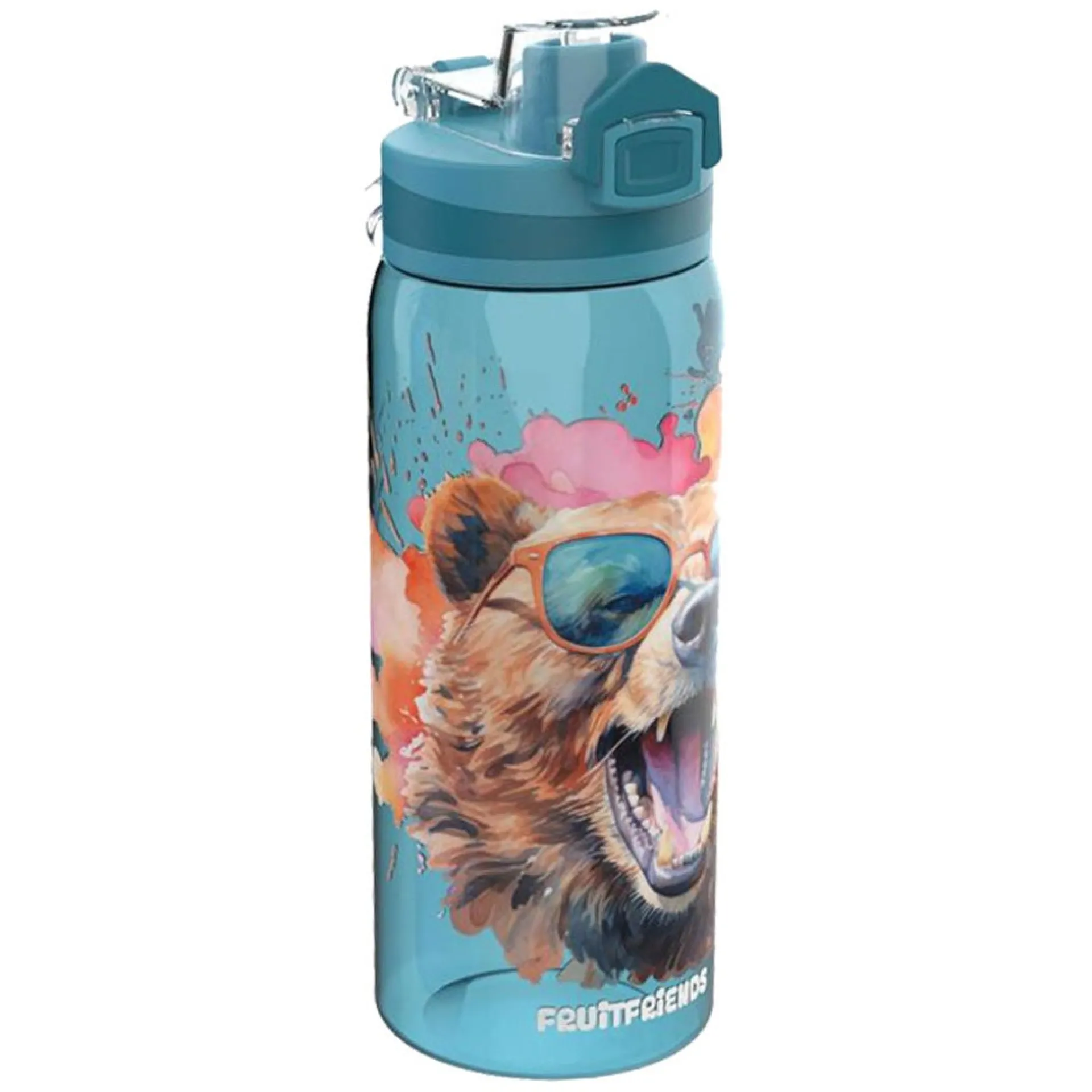Deze herbruikbare drinkfles heeft een stoere afbeelding van een beer met zonnebril, op een kleurrijke achtergrond. De fles is uitgevoerd in blauw kunststof met een transparante dop en een handige sluiting. Ook bevat de fles een driehoekige hanger, voor extra draaggemak. Ideaal om je drinken veilig mee naar school te nemen.
