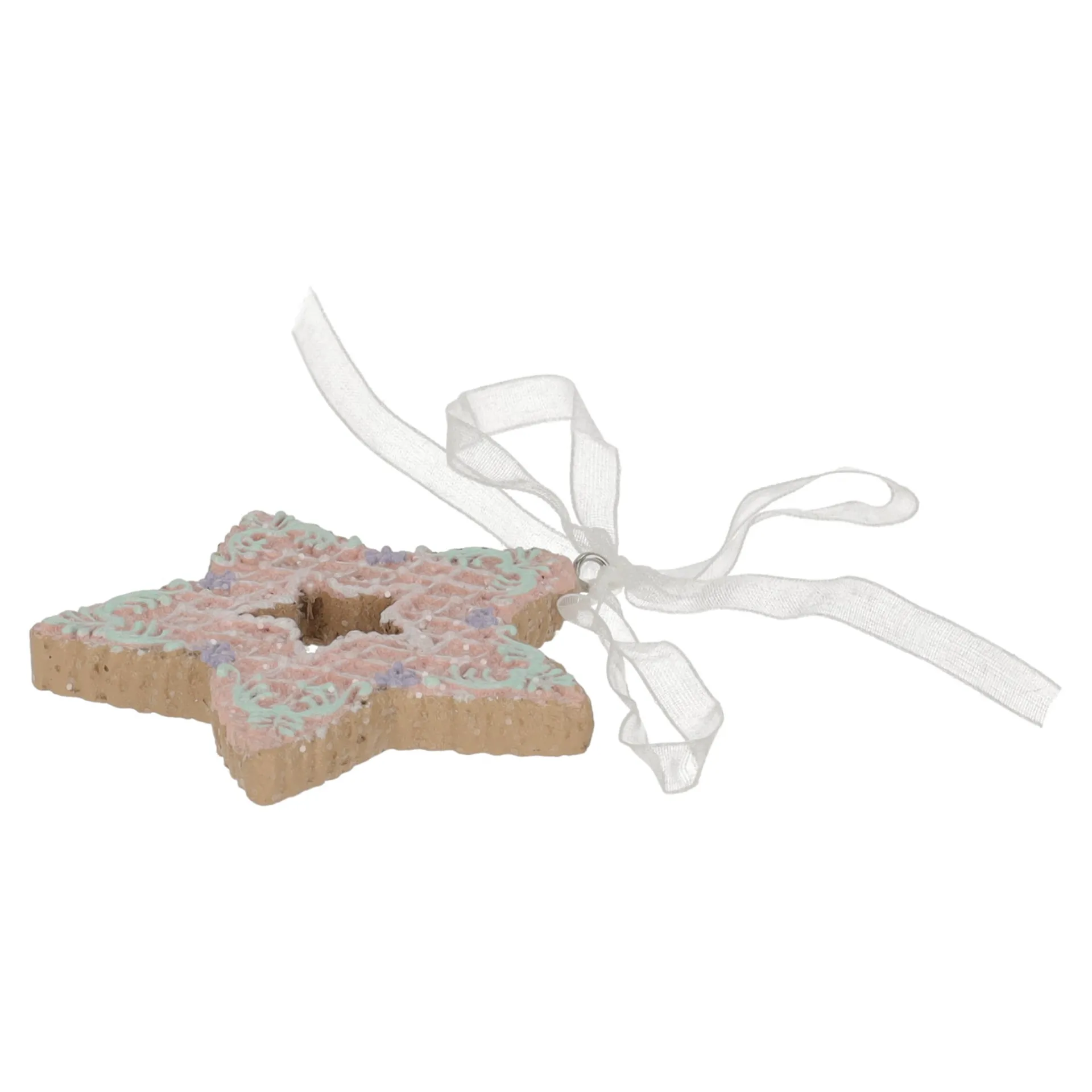 Deze feestelijke hanger in de vorm van een ster lijkt op een versierd gingerbread-koekje en zorgt voor een warme, gezellige uitstraling in de kerstboom. De ster is afgewerkt met roze glazuuraccenten en fijne details in mintgroen en paars. Voorzien van een lintje waarmee je de hanger eenvoudig ophangt.
