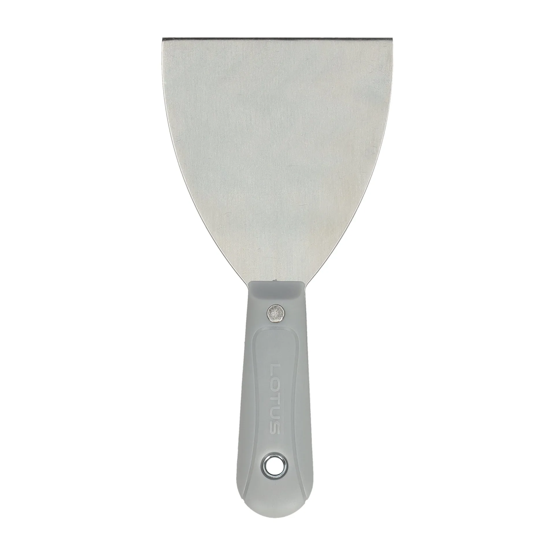 Plamuurmes Lotus met flexibel metalen, 100 mm breed blad en grijze handgreep. Geschikt voor het aanbrengen en gladstrijken van plamuur bij kleine reparaties aan wanden en andere oppervlakken. Verkrijgbaar in meerdere varianten.