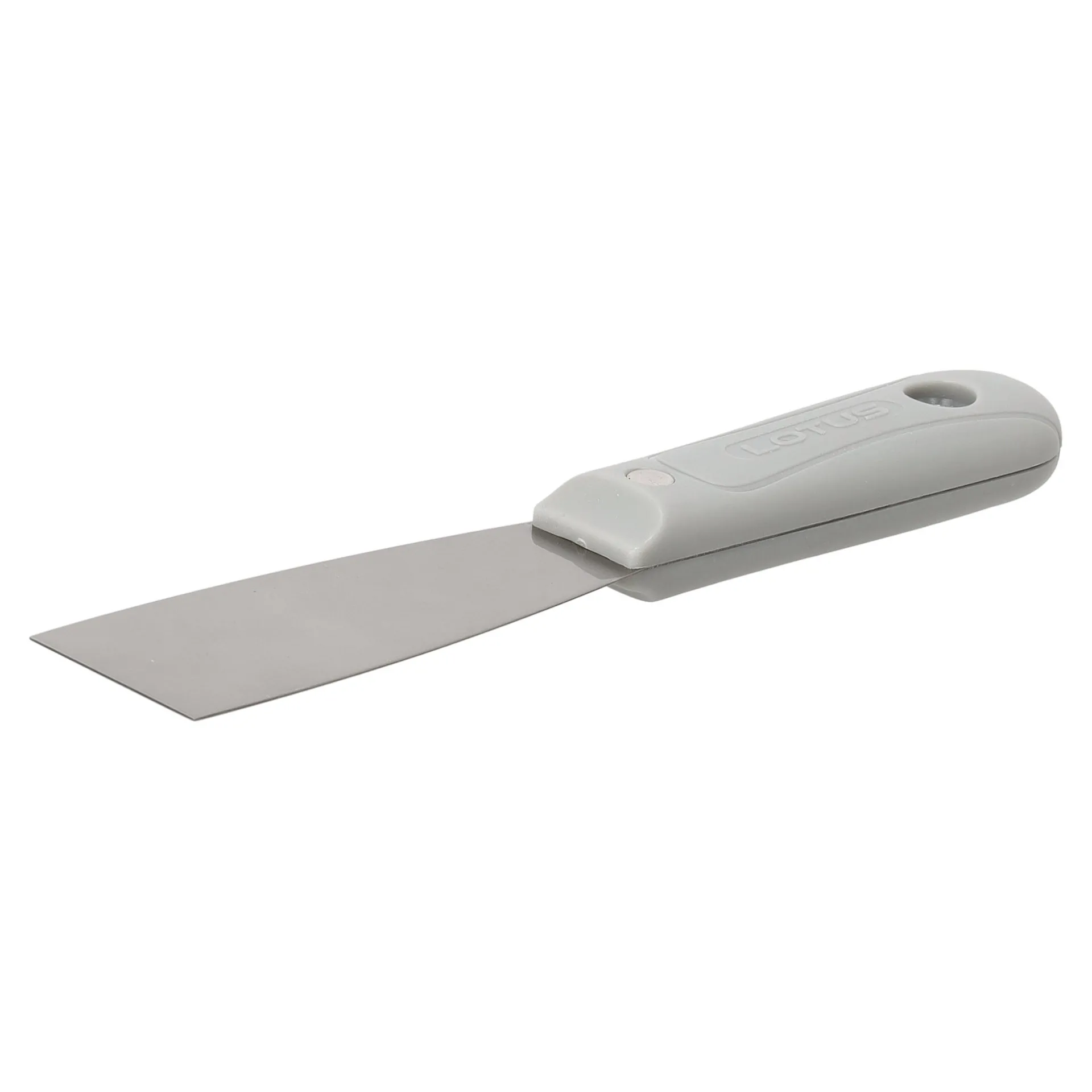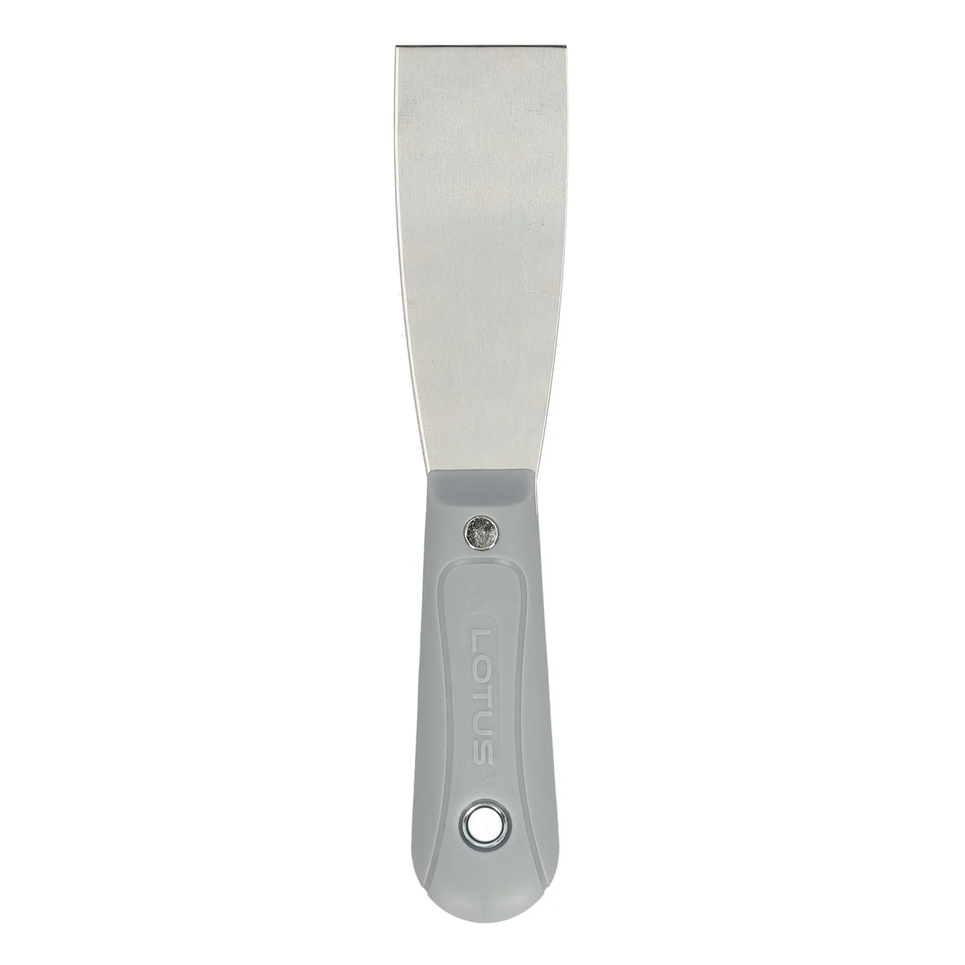 Plamuurmes Lotus met flexibel metalen, 38 mm breed blad en grijze handgreep. Geschikt voor het aanbrengen en gladstrijken van plamuur bij kleine reparaties aan wanden en andere oppervlakken. Verkrijgbaar in meerdere varianten.