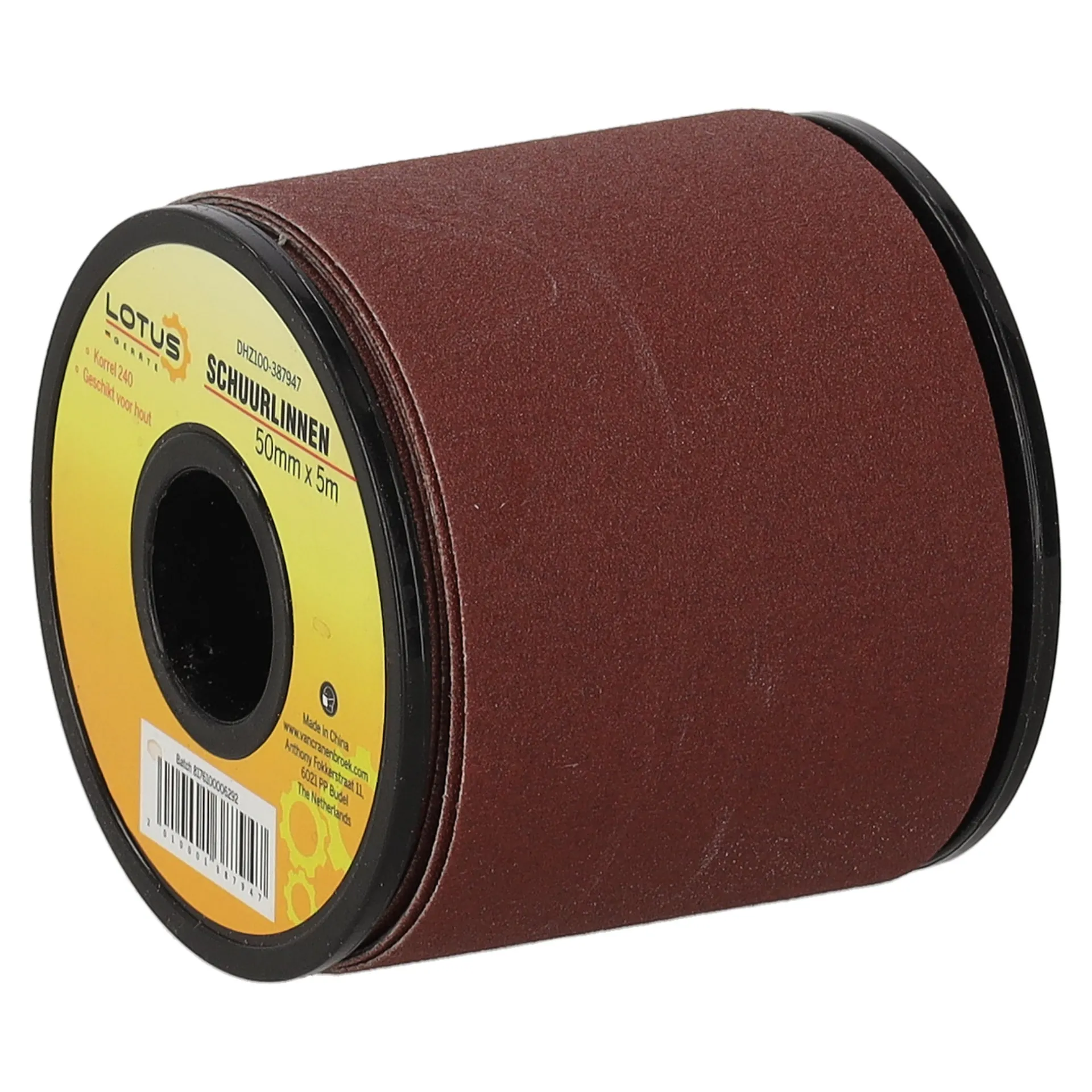 Schuurlinnen op rol Lotus 50 mm x 5 m met korrel 240, geschikt voor fijn schuurwerk op hout.