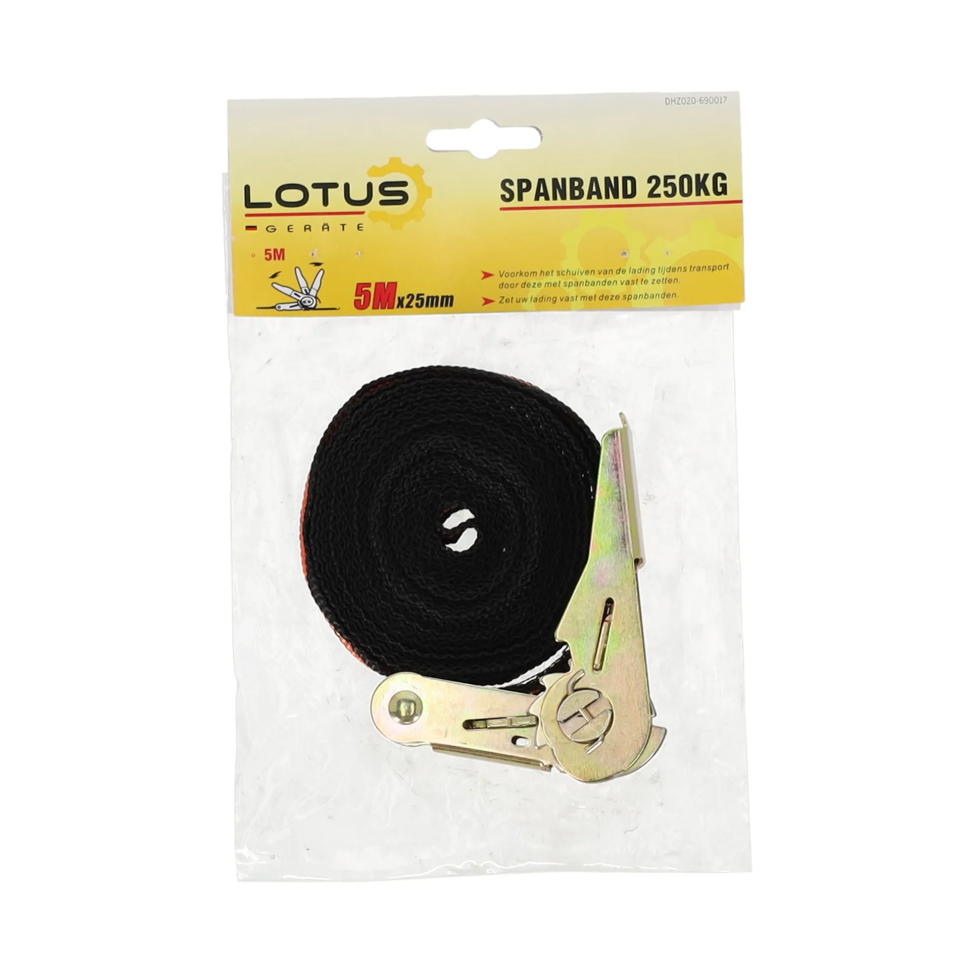 Professionele ratelspanband van 500 cm met ratelmechanisme. Speciaal ontworpen voor veilig transport en stevige fixatie van ladingen. Gemaakt van slijtvaste materialen voor langdurige prestaties.