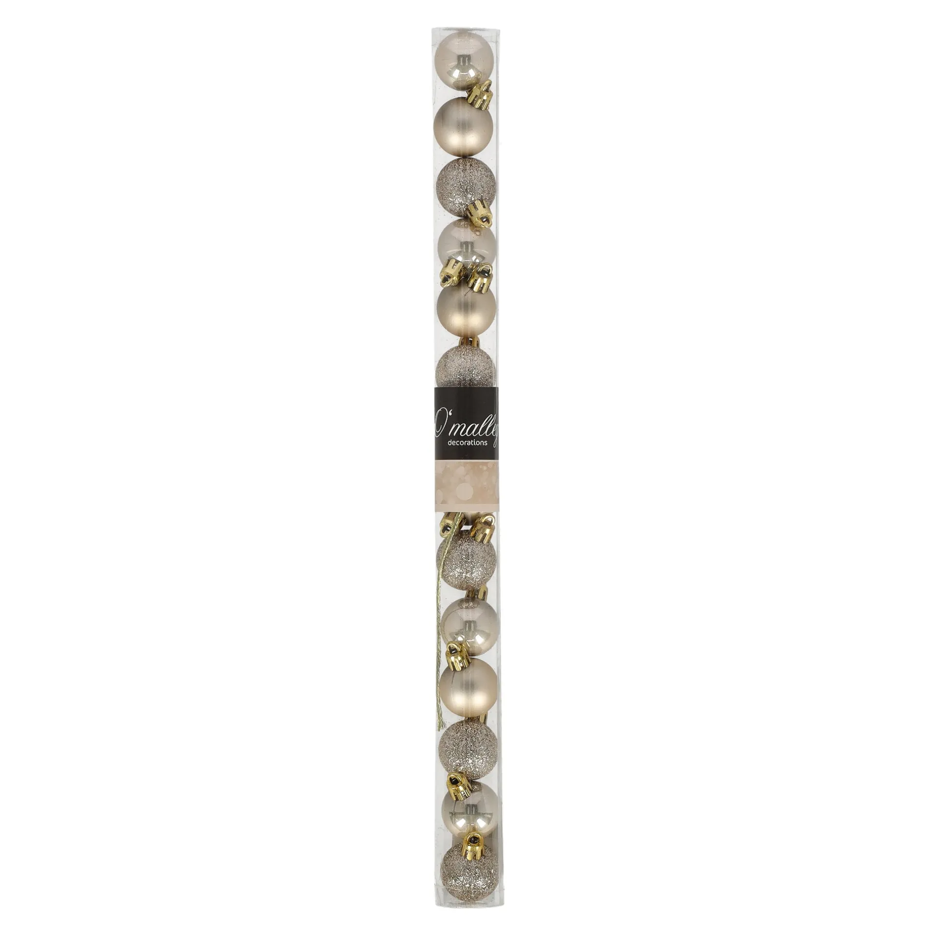 Set van veertien kleine decoratieve kerstballen met een diameter van 3 cm in een transparante koker. Bevat een mix van glanzende, matte en glitterafwerkingen in parelkleur. Ophanglusjes worden meegeleverd en geschikt voor diverse typen kerstbomen en sierdoeleinden.