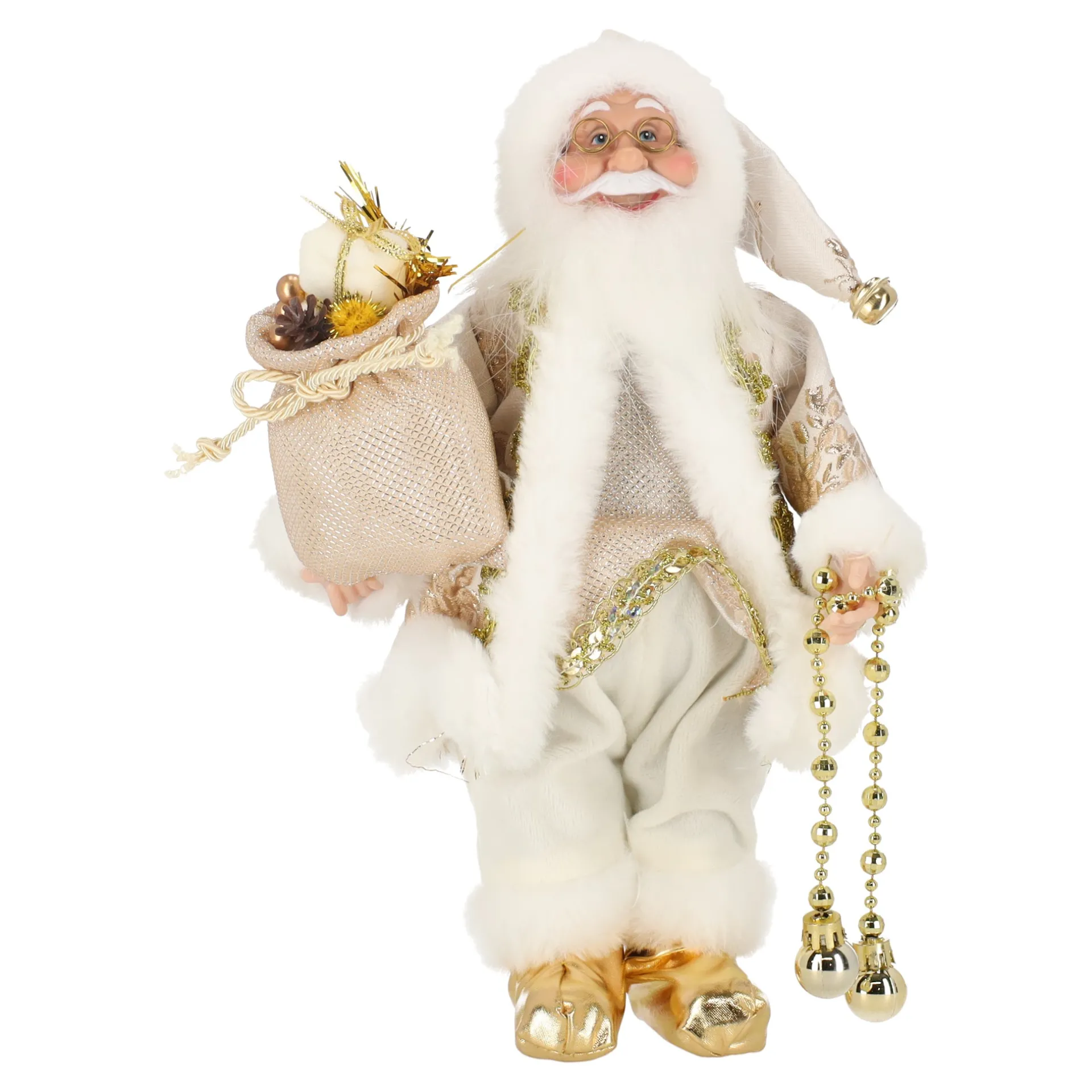 Stijlvolle kerstdecoratie in de vorm van een kerstman van 30 cm hoog. Uitgevoerd in gouden tinten, perfect om een feestelijke sfeer te creëren.